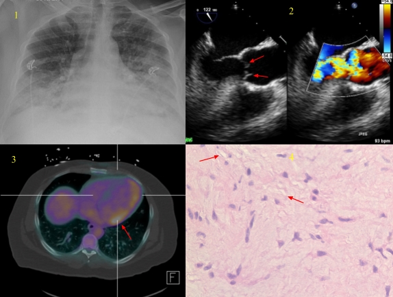 Case Presentation: A 39-years-old male with a history of hypertension presented with a one-month history of worsening shortness of breath associated with orthopnea, paroxysmal nocturnal dyspnea, and leg swelling. He denied fevers or chills, but he did report night sweats. On the day of hospitalization, he developed significant shortness of breath at rest associated with coughing white to pinkish mucus. He was in acute respiratory distress with oxygen saturation 72% on room air. Cardiopulmonary examination revealed regular heart rate, rhythm, no murmur, crepitations were heard in bilateral lung fields. Jugular venous distension was noted, pitting edema was present in bilateral lower extremities. The rest of the exam was unremarkable.His blood workup showed normal complete blood count, mildly elevated troponin (0.06 ng/ml), elevated BNP (250 pg/ml), CRP (3.4 mg/dl), and ESR (59 mm/hr). Electrocardiogram showed sinus tachycardia but no significant ST-T changes. CXR showed asymmetric interstitial infiltrate (Figure 1). A CT of the chest with contrast ruled out pulmonary embolism and aortic dissection. A transthoracic echocardiogram revealed severe aortic insufficiency (AI) with normal EF, a subsequent transesophageal echocardiogram (TEE) showed severe aortic insufficiency, and small masses on the ventricular side of the right and noncoronary cusps, interfering with the coaptation of the valve and causing severe AI (Figure 2). Subsequent cultures were negative for endocarditis and nuclear medicine myocardial perfusion study was strongly suggestive of cardiac sarcoidosis (Figure 3).