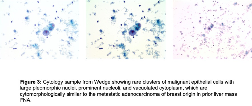 Case Presentation: A 45-year-old woman with a history of ER-/PR-/Her2+ breast cancer previously in remission, recently diagnosed with recurrent metastatic breast cancer pathologically and on imaging, presented to the hospital with multiple days of dyspnea and dry cough. Vitals were remarkable for hypoxia and tachycardia. Electrocardiogram showed sinus tachycardia without ischemic changes. Troponin and B-type natriuretic peptide levels were within normal limits. Complete blood count was notable for thrombocytopenia and peripheral smear showed schistocytes. Computed tomography angiography (CTA) of the chest was negative for pulmonary embolism (PE) and re-demonstrated stable multiple bilateral pulmonary nodules. She was admitted to the oncology service, and over the next 2 days, she became progressively more hypoxic and tachycardic. Transthoracic echocardiogram (TTE) demonstrated new right ventricular (RV) dilation with reduced systolic function concerning for acute RV failure. Repeat CTA of the chest was negative for PE. Emergent chemotherapy was initiated with pertuzumab, traztuzumab, and docetaxel. Right heart catheterization (RHC) demonstrated right atrial pressure of 10 mmHg, pulmonary artery pressure of 57/28 mmHg, pulmonary capillary wedge pressure of 8-10 mmHg, and Fick Cardiac Output of 2.4L/min consistent with pre-capillary pulmonary hypertension (pHTN). Cytology from the wedge were positive for malignant cells consistent with Pulmonary Tumor Thrombotic Microangiopathy (PTTM), and prednisone was initiated. Anticoagulation was not implemented due to thrombocytopenia. She was started on sildenafil, weaned to room air, and was discharged home on hospital day 18. Repeat TTE 3 months later showed resolution of the RV dilation and systolic dysfunction. Nine months after hospitalization she continues to do well.