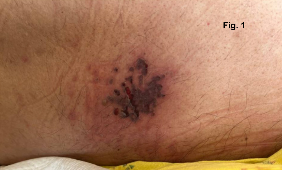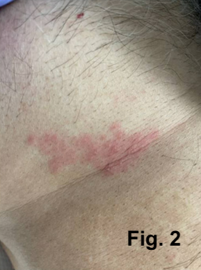 Case Presentation: A 62-year-old man with a history of diabetes presented to the emergency department with altered mental status (AMS) and increased urinary frequency. The patient was conscious but oriented only to self. Initial evaluation revealed hyponatremia (serum sodium: 125 mmol/L) with mild hyperglycemia (186 mg/dL). Further assessment of hyponatremia showed a serum osmolality of 263 mosm/kg, urine sodium of 111 mmol/L, and urine osmolality of 838 mosm/kg. A CT scan of his head showed no acute abnormalities, although parenchymal volume loss was noted. The patient was treated with hypertonic saline, oral urea, a loop diuretic, and fluid restriction (800 mL/day) for presumed syndrome of inappropriate antidiuretic hormone secretion (SIADH) based on urine osmolality findings. Early in his hospitalization, the patient developed scalloped, grouped erosions on his back (Fig. 1) and coalescing vesicles on an erythematous base across his right flank (Fig. 2). A PCR assay for varicella-zoster virus (VZV) on a skin swab returned positive, prompting initiation of intravenous (IV) acyclovir at 10 mg/kg every 8 hours. Blood serology revealed elevated VZV-specific IgG with normal IgM, consistent with viral reactivation. MRI of the brain showed atrophy without acute findings. Lumbar puncture revealed an opening pressure of 15 cm H2O, with cerebrospinal fluid (CSF) analysis showing elevated protein (79 mg/dL), increased nucleated cells (205/μL with 90% lymphocytes), and elevated glucose (144 mg/dL). CSF PCR assay for VZV was positive, leading to a diagnosis of disseminated VZV with encephalitis. IV acyclovir was continued. The patient’s clinical condition improved, serum sodium levels normalized, and a repeat lumbar puncture after 14 days of treatment was negative for VZV on CSF PCR. IV acyclovir was discontinued, and the patient was discharged in stable condition with mental status restored to baseline.