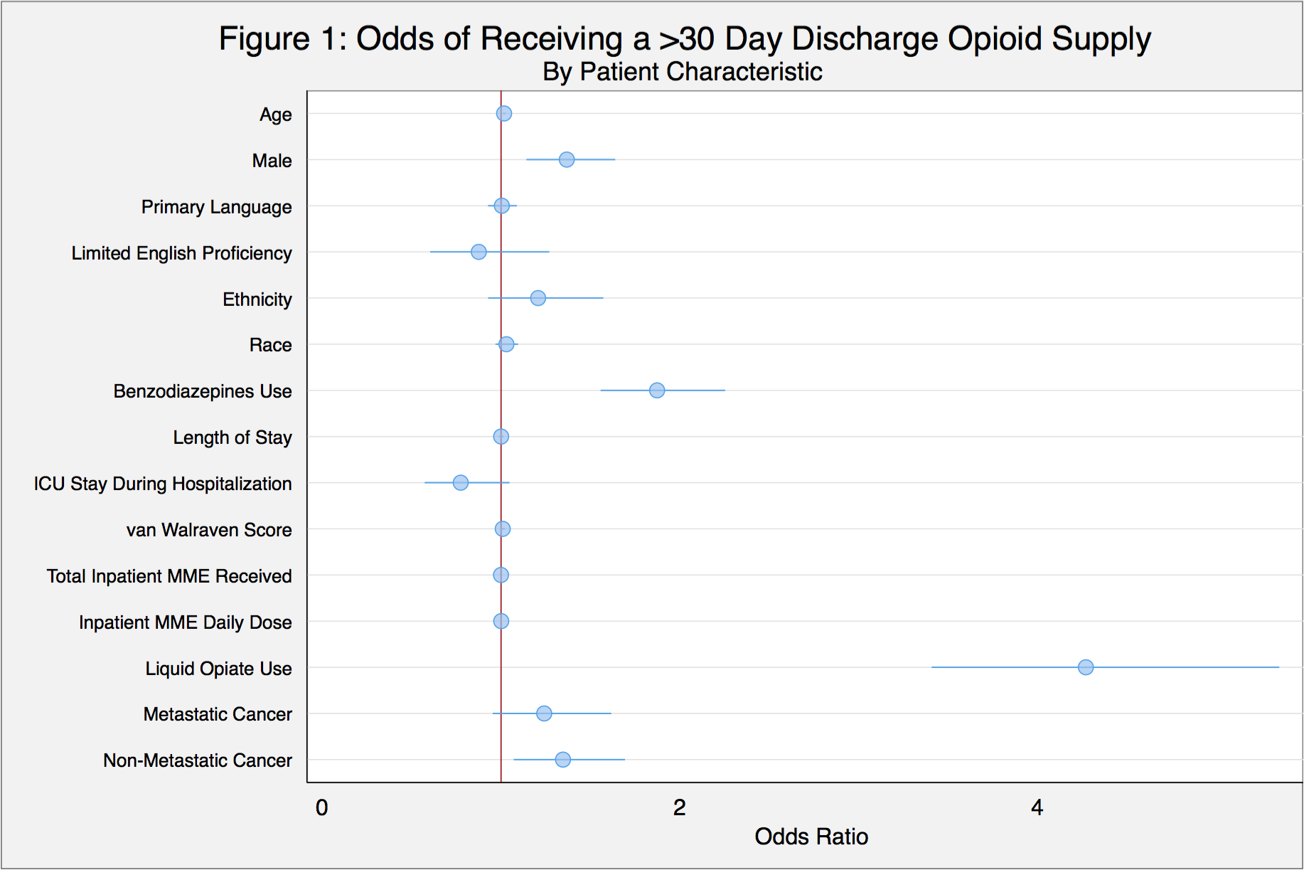 Results: We identified 9,275 medical inpatients prescribed opioids both during the hospitalization and on discharge who were eligible for the analysis. By the discharge prescription signature, 6,001 (64.7%) patients were prescribed less than 14 days, 2,688 (29.0%) received 14-30 days, and 586 (6.3%) received >30 days. Factors associated with receiving a >30 day supply include: being discharged with liquid opioids (OR 4.3 [3.4-5.4]), being on benzodiazepines prior to admission (OR 1.9 [1.6-2.6]), being male (OR 1.4 [1.1-1.6]), and having non-metastatic cancer (OR 1.3 [1.1-1.7]) (Figure 1). The maximum number of days prescribed was 1,875 days.