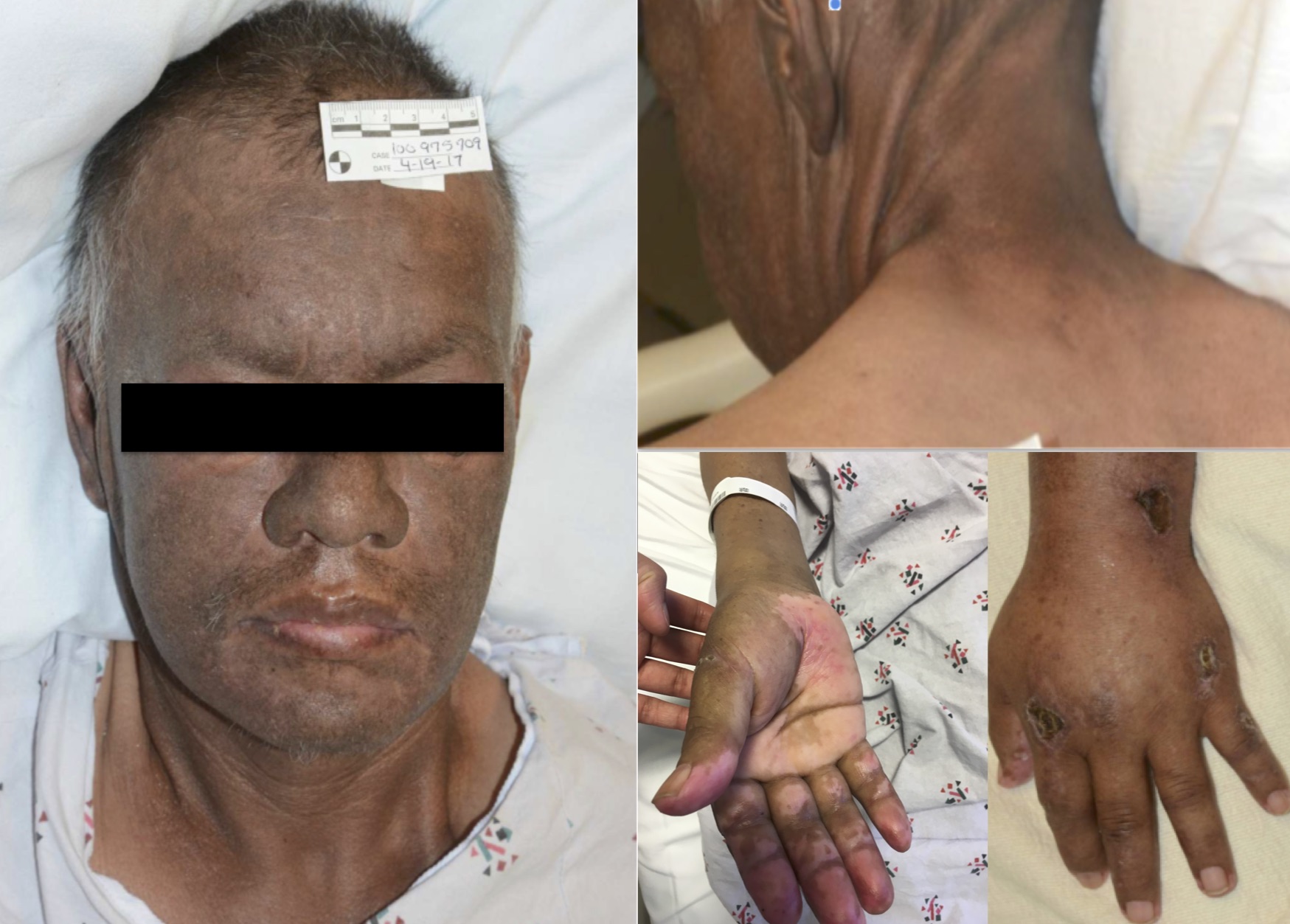 Case Presentation: A 50 yo Hispanic male with a history of Diabetes Mellitus Type 2 and hypertension presented to our hospital with seven months of joint pain and ulcers of his metacarpals, 50-pound weight loss, weakness, dysphagia, and rash. The patient first sought medical attention when he acutely developed severe arthralgia involving his hands. He went to a clinic where he was presumptively diagnosed with gout, and treated with allopurinol. Allopurinol did not relieve his pain, and patients’ symptoms worsened, prompting him to go to LAC+USC Medical Center.