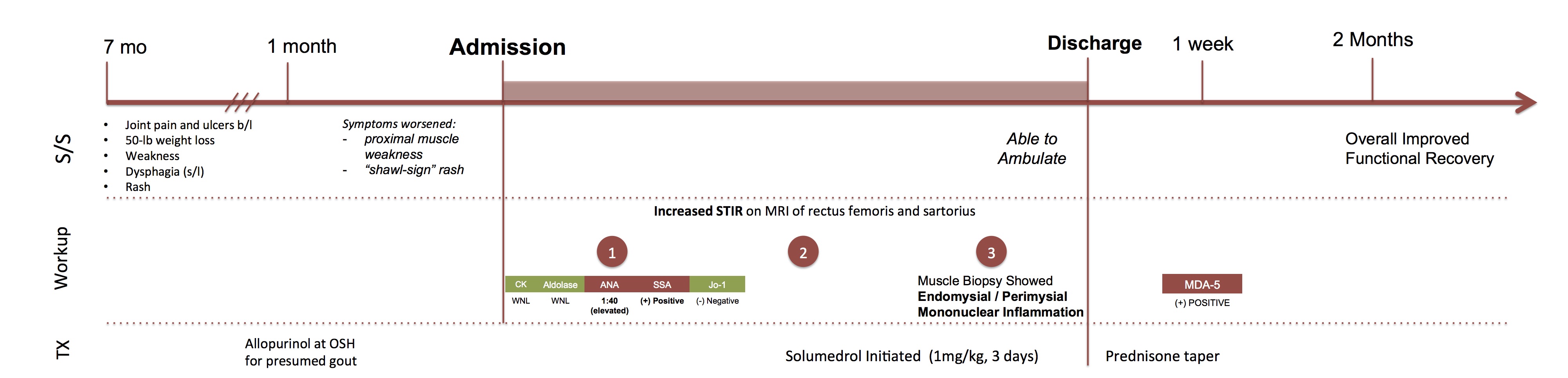 Rheumatology was consulted because serum CK and Aldolase levels were normal despite proximal muscle weakness and characteristic “shawl-sign” rash. ANA (1:40) and SSA were positive, while JO-1 was negative. On imaging, MRI showed increased STIR signal of the rectus femorus and sartorius muscles bilaterally. EMG showed mild myopathic changes in the proximal muscles. CT of chest, abdomen, and pelvis was unremarkable. The patient received 1 mg/kg of Solumedrol for 3 days and began a steroid taper. Muscle biopsy of the right quadriceps confirmed dermatomyositis with prominent atrophy of type 2 fibers and scattered mononuclear cells within endomysial and perimysial connective tissue. At this time, the myositis panel indicated the presence of Melanoma differentiation-associated gene 5 (MDA-5.) Patient regained enough strength to walk, and was discharged with a steroid taper and plans to start a steroid-sparing agent.