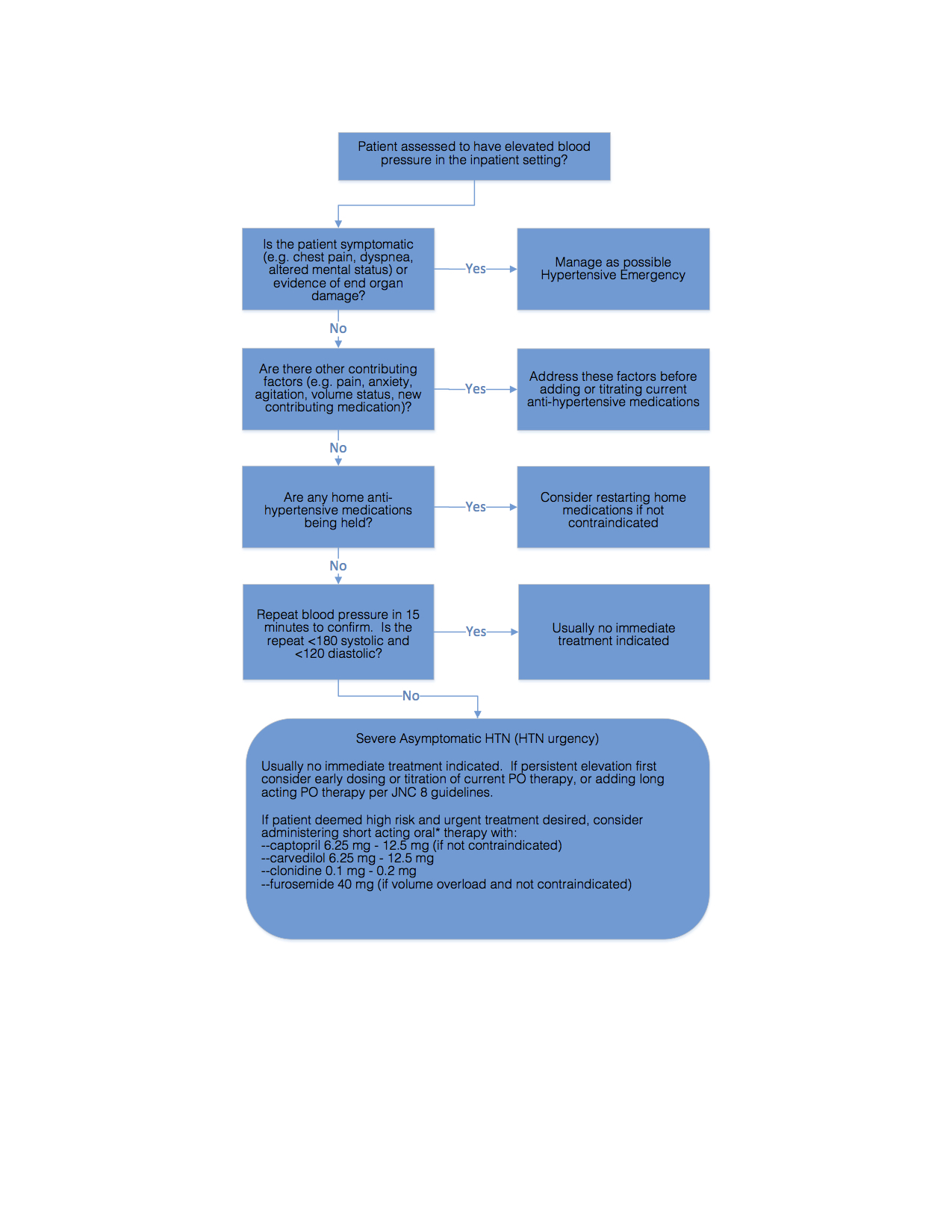 Purpose: Develop a standardized approach to the management of inpatient asymptomatic hypertension with the goal of reducing the use and possible complications of intravenous antihypertensives.