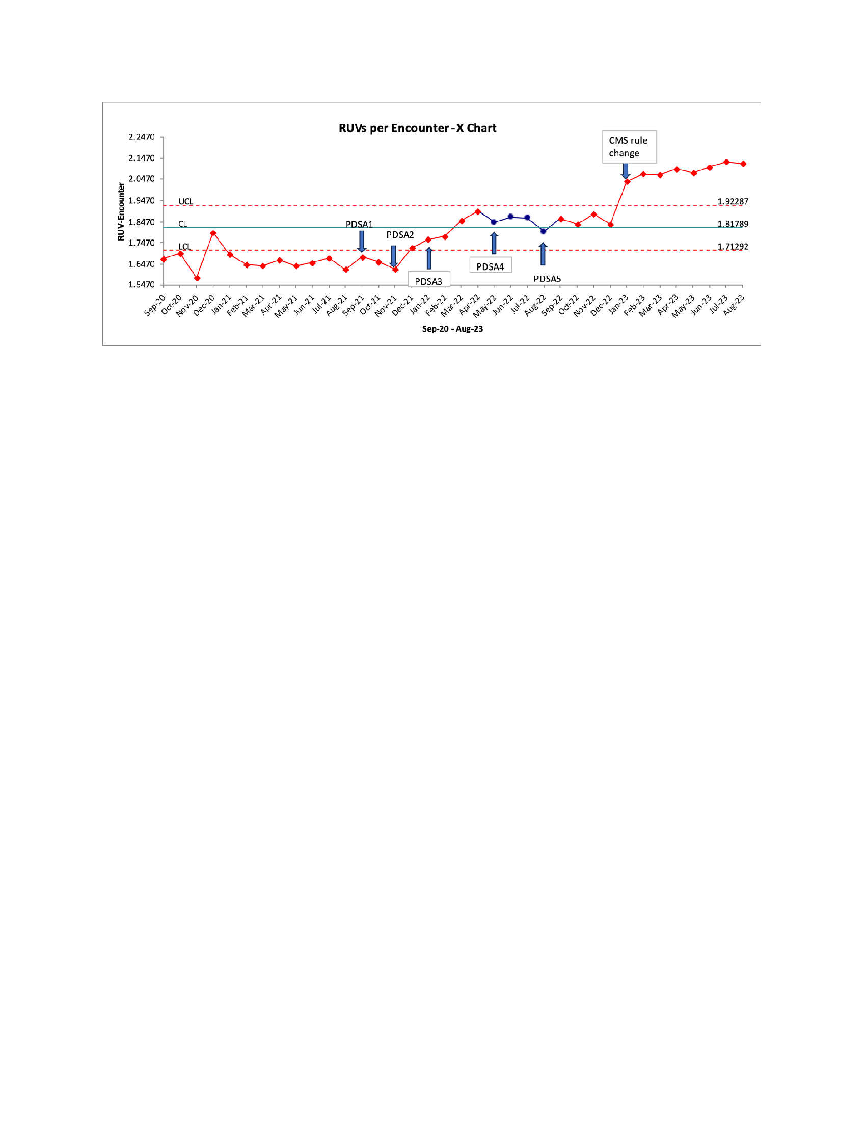 Conclusions: Our process improvement-based approach resulted in a statistically significant increase in billing levels, so they approximated national benchmarks. This was accompanied by a financially meaningful increase in RVU generation per encounter. We saw the greatest improvement in billing levels after the introduction of provider feedback packets (PDSA 2) and change in institutional guidance on copy and paste (PDSA 3). We also saw a significant increase in billing levels after the new Center for Medicare Services rules for inpatient billing went into effect in January 2023.