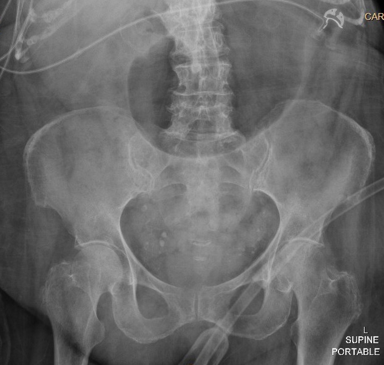Case Presentation: An 84-year-old woman with type 2 diabetes mellitus, hypertension, prior ischemic stroke, osteoporosis, and rheumatoid arthritis presented to the hospital after a fall with altered mental status from increased home benzodiazepine use. During her admission, she developed acute nausea and vomiting with a new leukocytosis and was found to have acute cholecystitis. She underwent placement of a percutaneous cholecystostomy tube (PCT), completed intravenous antibiotics, and was discharged with the PCT in place. During her rehabilitation stay, her PCT was accidentally removed. She followed up with general surgery and was advised of the risk of gallstone complications, but given her frailty, the decision was made to allow for additional recovery prior to an elective cholecystectomy. Three months later, the patient presented to the emergency room with two days of abdominal pain, nausea, and vomiting. She had normal vital signs, and exam was notable for mild generalized abdominal tenderness, distention, and decreased bowel sounds. Laboratory evaluation revealed a white blood cell count of 21,100 cells/ul, a hemoglobin of 11.1 g/dL, normal sodium and chloride levels, a bicarbonate level of 36 mmol/L, blood urea nitrogen of 34 mg/dL, creatinine of 2.02 mg/dL (baseline is between 1.3 and 1.5 mg/dL). She had marked gaseous gastric distention on her initial abdominal x-ray. Subsequent computed tomography scan of the abdomen showed interval fistulization of the gallbladder and the gastric antrum/first portion of the duodenum with multiple gallstones extending through the fistula into the stomach and duodenum, resulting in gastric outlet obstruction, known as Bouveret syndrome. A nasogastric tube was placed for gastric decompression, and she underwent esophagogastroduodenoscopy for lithotripsy and removal of the gallstones. Attempted removal of the stones led to an esophageal tear. An esophageal stent was placed, but the patient developed bilateral empyemas requiring chest tube placement. She had a prolonged hospital course during which she was intubated and required enteral feedings through a nasojejunal tube.