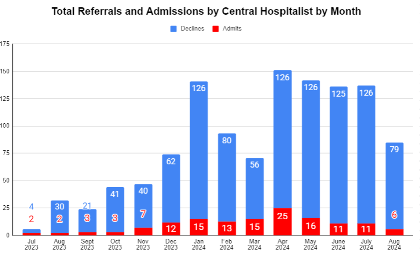 Description: Since its launch in July 2023, the Central Hospitalist has referred 1361 patients to HaH resulting in 164 admissions (12%). While this is already a dramatic improvement from our rates prior to implementing this screening tool (anecdotally, ~5%), further data suggests CH referrals were significantly stronger than the raw numbers imply. Since January 2024, only 21% of patients referred by the CH but not ultimately admitted were deemed clinically inappropriate by the HaH admitting team. The remaining 79% were appropriate targets for admission but ultimately were not admitted for non-clinical reasons, such as the patient declining the service or not passing our psycho-social screening process.