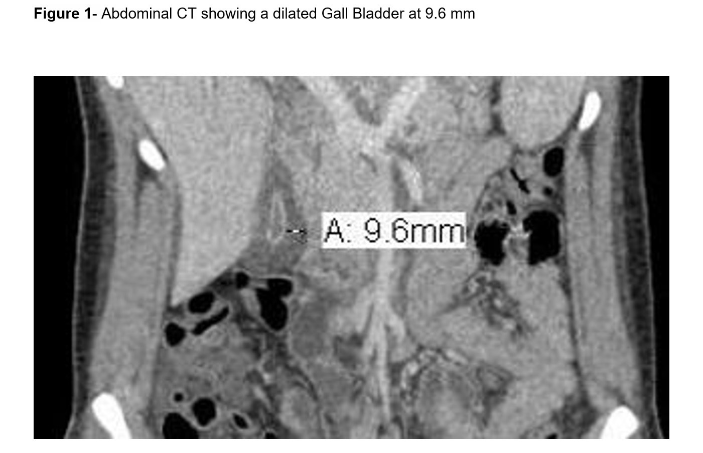 IMAGE 1: Abdominal CT showing dilated gallbladder at 9.6 mm