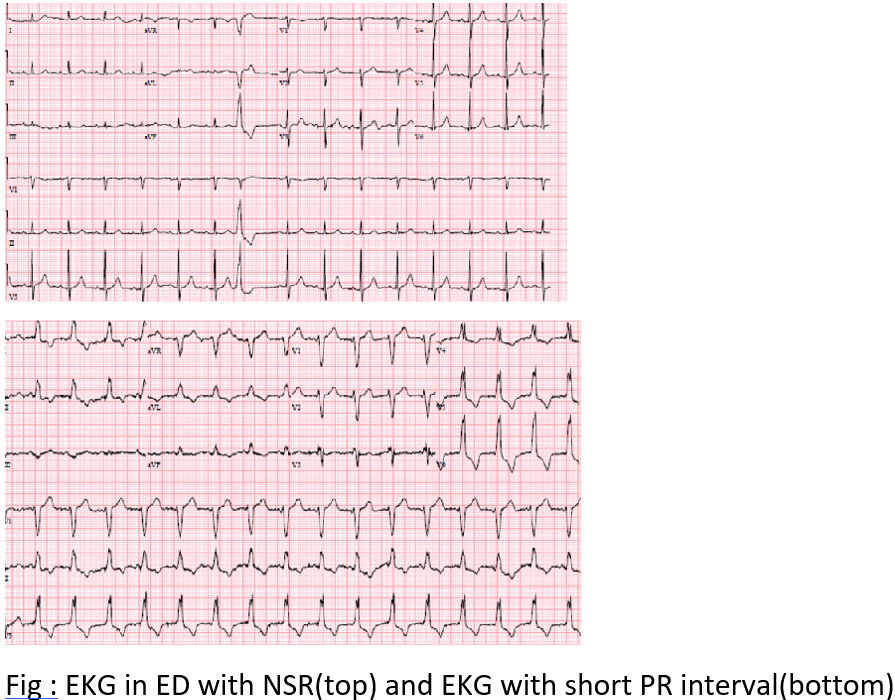 Case Presentation: 81 year old male with medical history of Abdominal Aortic aneurysm(AAA) ,COPD on home oxygen, diverticulitis post colon resection 10 years ago presented to the emergency department with painless hematochezia for 4 days. CT abdomen showed an interval increase in size of his AAA to 6 cm diameter and 8 cm in length with no causative finding for his gastrointestinal bleed .His Hemoglobin dropped from 12 to 10.1 and rest of the labs were normal . Initial EKG in ED was in normal sinus at 88 with intermittent premature atrial complexes and aberrant conduction of LBBB pattern. QRS complex and PR intervals were normal. The patient was admitted to hospital for evaluation of GI bleed and enlarging AAA . The following day, he had intermittent bleeding with borderline tachycardia and increased frequency of atrial ectopic on telemetry. A change in QRS morphology was noticed on telemetry and a repeat EKG was done which showed a new onset Left Bundle Branch Block (LBBB ) with sinus tachycardia at 108 and short PR interval of 56ms. The patient denied chest pain and was hemodynamically stable throughout. His cardiac enzymes were negative and transthoracic echo showed normal Left ventricular function with no wall motion abnormality . The same night, the patient had another episode of massive hematochezia. His hemoglobin dropped to 6.0 and he now developed a narrow complex tachycardia likely Atrio ventricular rentrant tachycardia (AVRT) at the rate 200bpm. His tachycardia terminated with adenosine to reveal normal sinus rhythm with normal QRS morphology . Cardiology was consulted, and made a diagnosis of right sided concealed accessory pathway with preferential retrograde conduction . The reason for transient anterograde conduction during acute stress could not be completely explained but assumed to be due to sympathetic overdrive and frequent atrial ectopic .He was transferred to the ICU and required multiple transfusions .The patient and family eventually wished for comfort care measures and expired shortly in a hospice facility