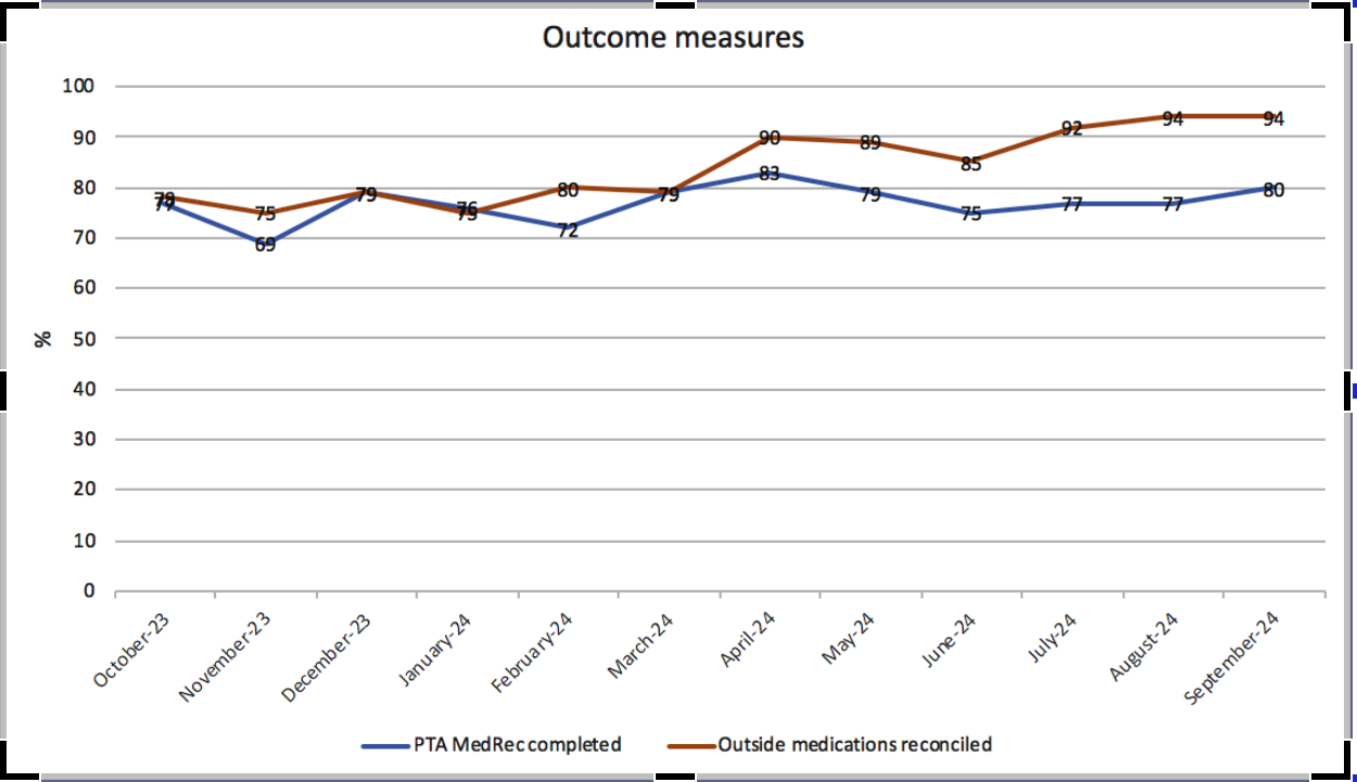 Methods: Collaborating with a multidisciplinary team, we partnered with the clinical pharmacists team to enhance the accuracy of active home medication lists by reviewing admissions in the ED and providing recommendations to residents. Medication reconciliation is completed within 24 hours upon admission. Sources for medication reconciliation include EHR encounters, patients’ personal records, family members, and their pharmacy.Epic specialists simplified the admission medication reconciliation process by consolidating multiple steps into a single screen in Epic, moving outside medication reconciliation to the “sign and hold” tab for easier provider access. To address compliance, providers are notified of incomplete admission medication reconciliation within 24 hours, tracked monthly by auditors through chart review. Education to the health care providers included audiovisual teaching tools, noon conference sessions, one-on-one resident training, and visual aids like posters in workstations, results are supported by regular feedback and monthly performance reviews.