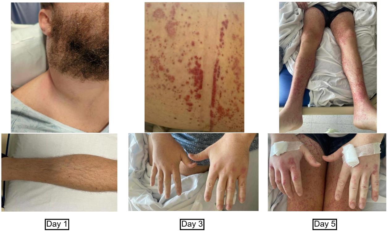 Case Presentation: A 34-year-old male without significant past medical history presented with fevers, progressive purpuric rash that started in the ankles and spread in a centrifugal distribution, joint stiffness, as well as a rapidly progressive right-sided neck mass. Two weeks prior to presentation he had experienced sore throat and subjective fevers which self-resolved. One week later, he noticed a “golf ball-sized” mass developing on his right neck. Pertinent social history included travel to Mexico 6 weeks prior and recent unprotected sexual encounters with a new male partner.Exam was notable for a large, erythematous right-sided neck mass that was tensely swollen, causing a loss of cervical range of motion and a widespread non-blanching petechial rash that was concentrated over bilateral ankles, wrists, and medial thighs, but spared the head and torso. Additionally, there was swelling and bruising of the scrotum, palms, and soles. The rash evolved and concentrated around the joints of the upper and lower extremities.Labs were notable for neutrophilic leukocytosis (17.44), elevated ESR (33) and CRP (207.2), creatinine 0.5-0.8, normal C3 and C4, and elevated IgA (658). Negative studies included HIV 1/2, Hepatitis A/B/C, syphilis, Lyme, Rocky Mountain Spotted Fever, Mumps, Parvovirus, Chlamydia, Gonorrhea, Malaria/Babesia, EBV, CMV, Erlichia/Anaplasma, Influenza A/B, RSV, and blood cultures.CT of the neck revealed bulky adenopathy with at least one necrotic lymph node and enlargement of the sternocleidomastoid muscle consistent with intramuscular hemorrhage.Fine needle aspiration and biopsy of the neck mass revealed infection with beta-hemolytic Group A streptococci. Dermatology determined his presentation was most consistent with Henoch-Schönlein purpura. He was treated with a 14-day course of amoxicillin-clavulanic acid. At outpatient follow up, his rash had resolved, and lymphadenopathy and swelling were improving. His renal function continued to be unimpaired.