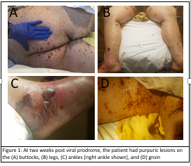 Discussion: IgA Vasculitis is a systemic vasculitis that affects mostly children with an estimated incidence of 20 per 10,000, with peak incidence between ages four and six years old. The adult form is rare, and patients with the disease are at greater risk for developing severe complications, especially end-stage renal disease. IgA Vasculitis occurs primarily in winter months when upper respiratory infections (URIs) are at highest incidence, and nearly half of cases are associated with a recent URI with Streptococcus etiology. This is a case of adult-onset IgA Vasculitis with severe dermatologic manifestations and renal involvement. The course of the disease is clearly illustrated – an infectious prodrome, an inappropriate immune response leading to vasculitis, then renal disease. Both responded to high-dose pulse glucocorticoid therapy.