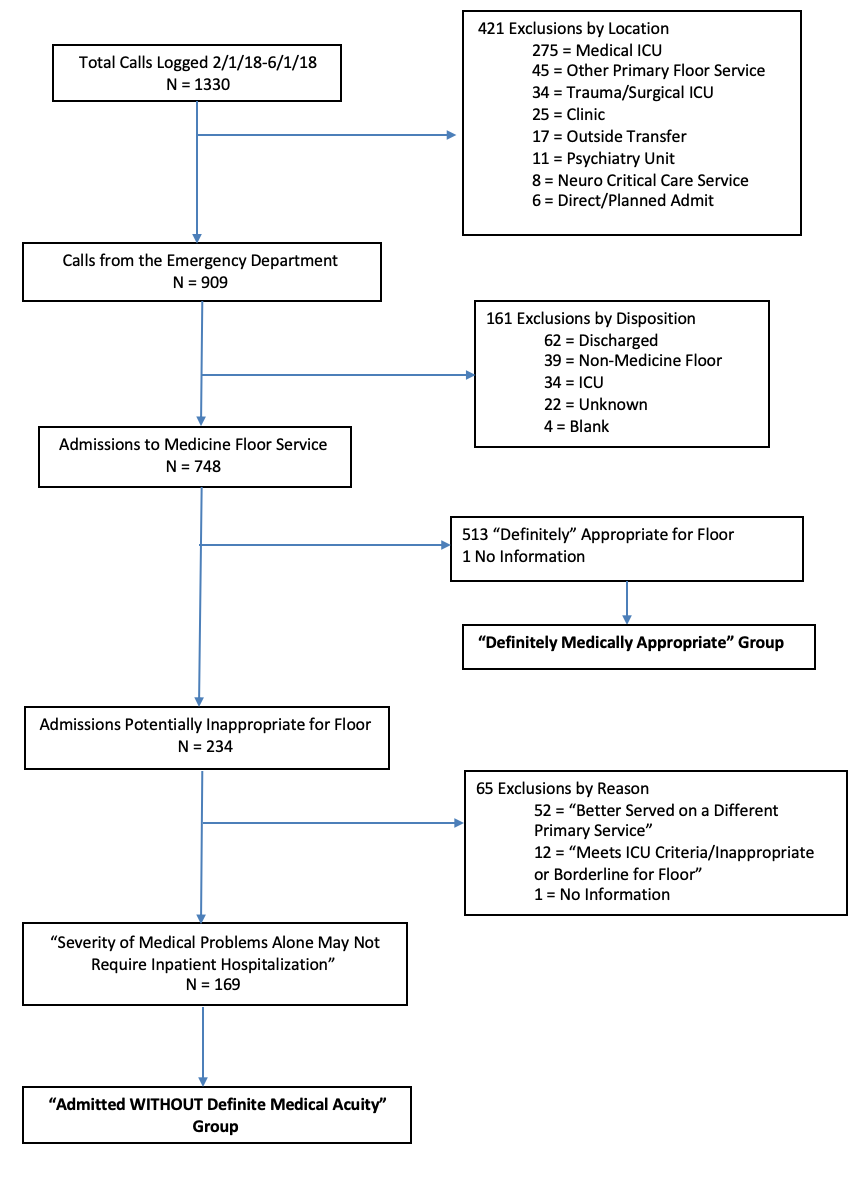 Methods: This was a retrospective cohort study of 300 admissions from 2/1/2018 to 6/1/2018 in an urban academic medical center (see Figure 1). We defined the exposure as hospitalization without definite medical acuity, as assessed by an attending physician faculty member upon admission. Chart review using the Institute for Healthcare Improvement Global Trigger tool method was used to measure adverse events. University of Washington IRB approval was granted for this study.