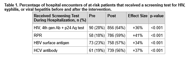 Conclusions: An electronic medical record BPA was able to increase screening for HIV, syphilis, and viral hepatitis among hospitalized patients with SUDs.
