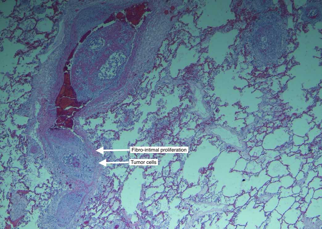 Discussion: Pulmonary tumor thrombotic microangiopathy is a rare but devastating complication in advanced metastatic cancers wherein tumor cells embolize into pulmonary arteries and induce activation of the coagulation cascade with intimal proliferation within small pulmonary arteries. Herbay et al first described a 3.3% prevalence of PTTM in 630 cancer autopsies with gastric adenocarcinoma being most commonly associated. It usually presents as acute or subacute dyspnea with hypoxia and rapidly progressive Pulmonary Artery Hypertension (PAH) leading to cor pulmonale. Bloodwork is usually non-diagnostic, with non specific elevations of D-Dimer and LDH. Imaging is mostly negative, although CT may show dilated pulmonary arteries ,V/Q scan may reveal peripheral perfusion defects, and FDG PET scan may show uptake in lungs, however, smaller tumor deposits are likely to be missed. Histological diagnosis may be obtained via lung biopsy or pulmonary artery catheter blood aspiration. While PTTM remains primarily a post-mortem diagnosis, there have been a few cases where early diagnosis and treatment with pulmonary vasodilators, chemotherapy and anticoagulation has led to survival in months to years. In most of these cases, patients had known cancer, however, cor pulmonale as the first clinical presentation is extremely rare.
