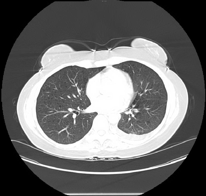 Discussion: There are two types of LAM- sporadic LAM (S-LAM) and LAM associated with tuberous sclerosis complex (TSC-LAM). TSC-LAM usually present with TSC manifestations along with a positive family history of TSC. A confident clinical diagnosis can be established when typical cystic changes of LAM are seen in high resolution CT and accompanied by any of the following: renal angiomyolipomas, chylous pleural effusions or vascular endothelial growth factor (VEGF)-D level >800 pg/ml. VEGF-D level also helps in correlating with the disease activity. If clinical suspicion remains positive without meeting the criteria described above, lung or lymph node biopsy gives definitive diagnosis. Sirolimus, an mTOR kinase pathway inhibitor, is the current drug of choice for LAM. Sirolimus acts by preventing abnormal cell proliferation. Patients are monitored at regular interval with pulmonary function test for progression of the disease, which most of the time shows obstructive picture.