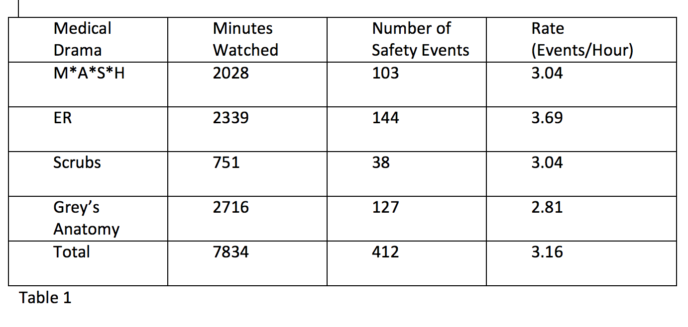 Methods: We selected 4 medical television dramas: M*A*S*H (1972), ER (1994), Scrubs (2001), and Grey’s Anatomy (2005). We created a RedCAP data entry tool similar to our institution’s online patient safety event reporting system. Student coders were trained using a brief presentation on how to identify and report patient safety events and introduced to qualitative coding methods. They coded an episode of The Resident (2018) as a group with the primary investigators to standardize the coding process. They coded 3 episodes of St. Elsewhere (1982) on their own, which were reviewed for content and clarity. The coders watched their assigned series and recorded patient safety issues in the data entry tool.