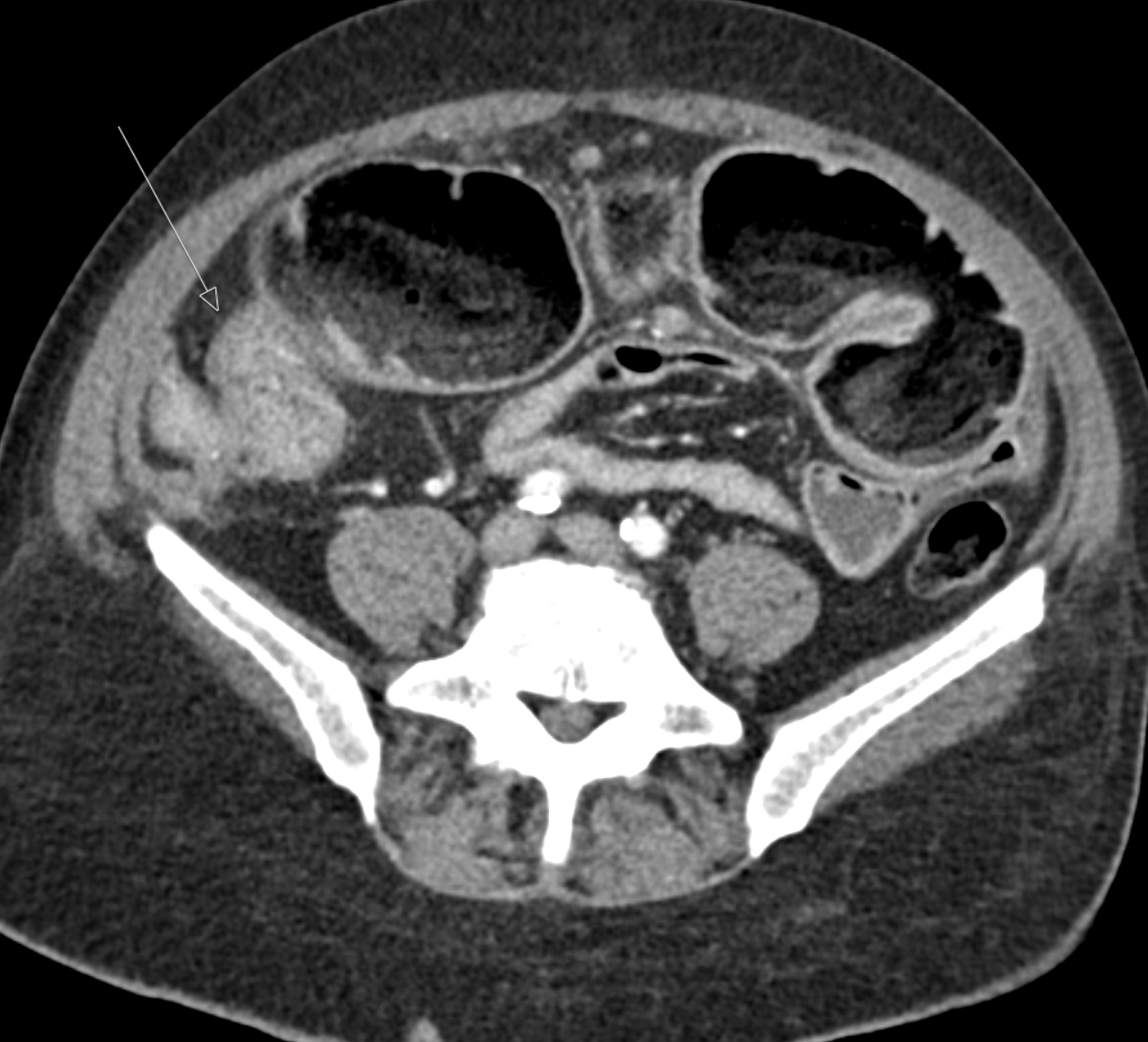 Case Presentation: A 61-year-old man with a history of GERD, tobacco, and alcohol use presented to our hospital with a week-long exacerbation of subacute abdominal pain and constipation. He had presented multiple times in recent months to outside hospitals with similar symptoms. CT and MRI scans showed a small bowel obstruction (SBO) with a transition point, terminal ileitis, and fat stranding. An EGD was unremarkable. Colonoscopy showed an ulcer of the ileocecal (IC) valve, a non-traversable stricture at the terminal ileum, and a 5 cm polyp in the descending colon. Biopsies showed normal ileal mucosa, focal acute colitis of the IC valve, and high-grade dysplasia of the polyp. GI and general surgery were consulted, a diagnosis of Crohn’s was made, his symptoms improved with steroids, and he was discharged on a prednisone taper with GI clinic follow-up. He was unable to present to the GI clinic due to recurrence of symptoms. When he presented to our hospital, the workup was remarkable for normal ESR, CRP, B12, CMP, and CBC. CT and MRI enterography with and without contrast showed findings similar to prior evaluations. GI recommended surgical resection for a stricture deemed unresponsive to medical management. In the operating room, an obstructing mass was noted at the IC valve. Pathology showed a 4 cm invasive poorly differentiated adenocarcinoma with metastases to multiple lymph nodes and the peritoneum.