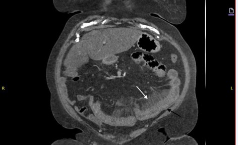 Case Presentation: A 60-year-old Caucasian female with a history of morbid obesity, type 2 diabetes, uncontrolled hypertension, and obstructive sleep apnea presented to the emergency department with chief complaint of a headache. Her blood pressure was elevated, and she was discharged on lisinopril 20 mg daily.Two days later, she returned with severe, diffuse abdominal pain, watery diarrhea, nausea, and vomiting. Her vitals were stable, and the physical exam showed mild abdominal tenderness without guarding or rigidity. A CT scan revealed small bowel thickening, mesenteric stranding, and reactive free fluid (Figure One). Initial lab work showed leukocytosis at 14.93 (normal- 4.5 to 11.0 × 109/L), elevated hemoglobin at 16.0 (normal- 11.6 to 15 grams per deciliter), and increased hematocrit of 48.5 (normal- 36 to 48%). Electrolytes and stool tests were normal, and EKG showed normal sinus rhythm. These findings support the diagnosis of intestinal angioedema, particularly when coupled with the patient’s symptoms (abdominal pain, nausea, diarrhea) and recent initiation of lisinopril. The absence of significant inflammatory markers or other structural abnormalities helps rule out alternative causes, strengthening the case for drug-induced angioedema.