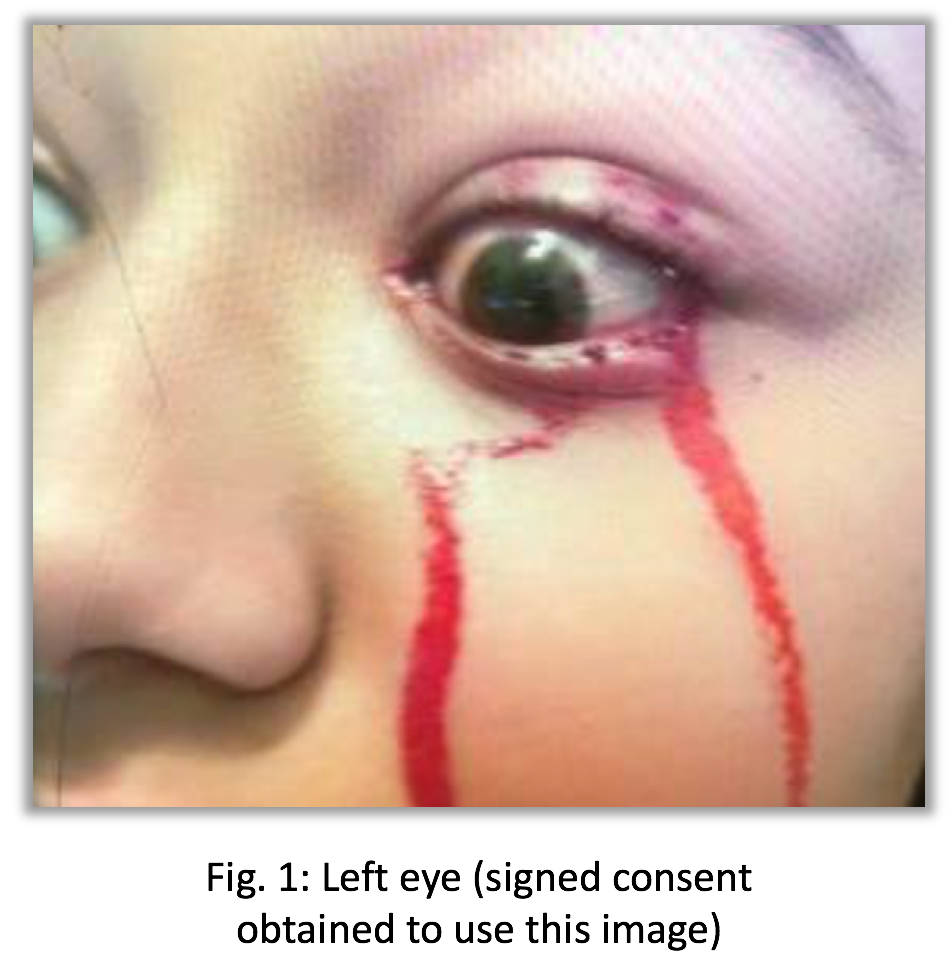 Case Presentation: A 12 year-old girl with a history of asthma and migraine headaches presented to the ED with a one week history of headaches and bloody tears. She first developed headache and left eye pain and pruritis one week prior, followed by blurry vision and bloody discharge from the left eye. She presented to an outside ED and was discharged with no specific treatment. After returning to the outside ED with no improvement, she was referred to an ophthalmologist. MRI of the brain and orbits was obtained, which noted normal appearance of the orbits and brain, but left maxillary sinusitis with a notable fluid level. She was prescribed topical ophthalmologic solution, oral antibiotics, and oral corticosteroids. She was seen the next day by another ophthalmologist with reported normal exam other than hemolacria. She was told to continue treatment. The day prior to admission, she experienced visual loss of the left eye, prompting a visit to our ED. On exam, other than mild tachycardia at 93 bpm, vital signs were unremarkable. Her exam was unremarkable other than her left eye, found to have bloody discharge (Figure 1); intact extraocular movements; equal, round, and reactive pupils bilaterally, with no conjunctival injection. Left eye visual acuity was noted to be 20/200, but was thought to be due to bloody discharge. She was admitted and started on intravenous ampicillin/sulbactam after review of outside hospital MRI confirmed left maxillary sinusitis. Consultation with ophthalmology and head and neck surgery confirmed diagnosis and treatment. Her hemolacria rapidly resolved, and she was discharged on oral amoxicillin clavulanate and intranasal fluticasone.