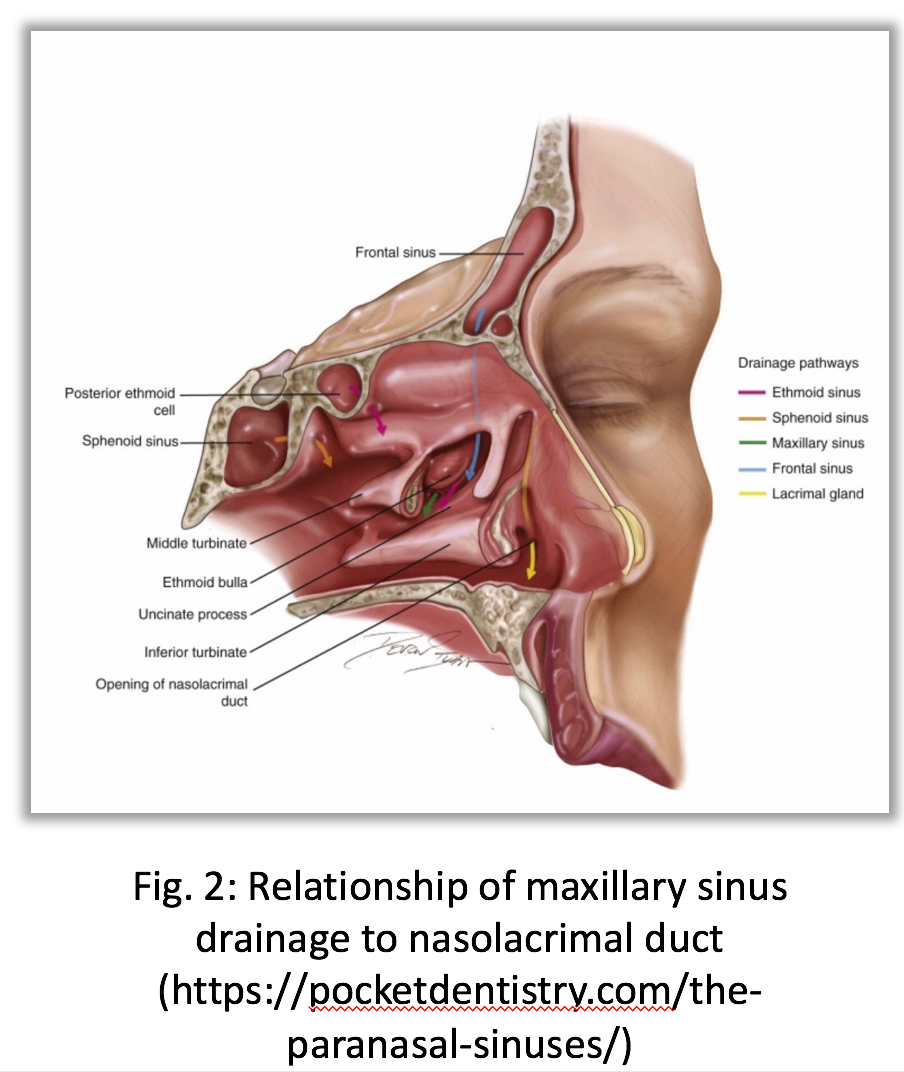 Discussion: Hemolacria, or blood present in tears, is a rare presenting sign, and even more rare in the pediatric population. Underlying etiologies can include capillary hemangioma, telangiectasia, trauma, retrograde epistaxis, conjunctivitis, and nasal or paranasal neoplasms. Rarely, patients can be afflicted by intermittent hemolacria with no clear etiology after extensive workup. Hemolacria can also be seen after prior head and neck surgery, including Le Fort osteotomy, orbital floor fracture repair, and retinal surgery. Underlying bleeding diatheses have been described when associated with other bleeding and/or bruising. Bloody drainage from the sinuses can enter the nasolacrimal duct due to its proximity (Figure 2),, leading to hemolacria, as in the case of our patient.