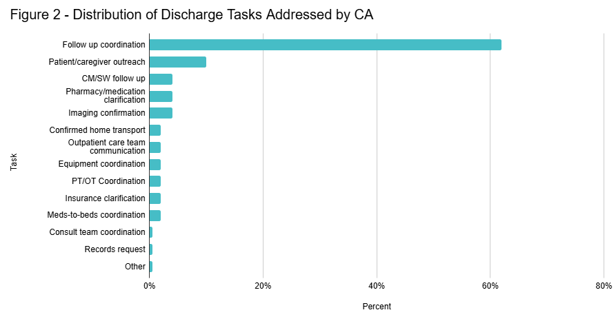 Results: Data were collected over 12 months (October 2023–September 2024), involving 1,002 specific instances in which the hospitalist identified a patient likely to discharge in the following 24 hours. Discharge barriers within 24 hours of expected discharge were identified in 67% of cases, with 61% of this subsegment attributed to acute medical issues and 39% to coordination or administrative barriers. While no action was required in 81% of encounters, the CA directly facilitated task completion in 19%, addressing barriers such as follow-up coordination, patient outreach, and pharmacy clarifications. Figures 1 and 2 illustrate the distribution of barriers and task domains addressed, respectively.