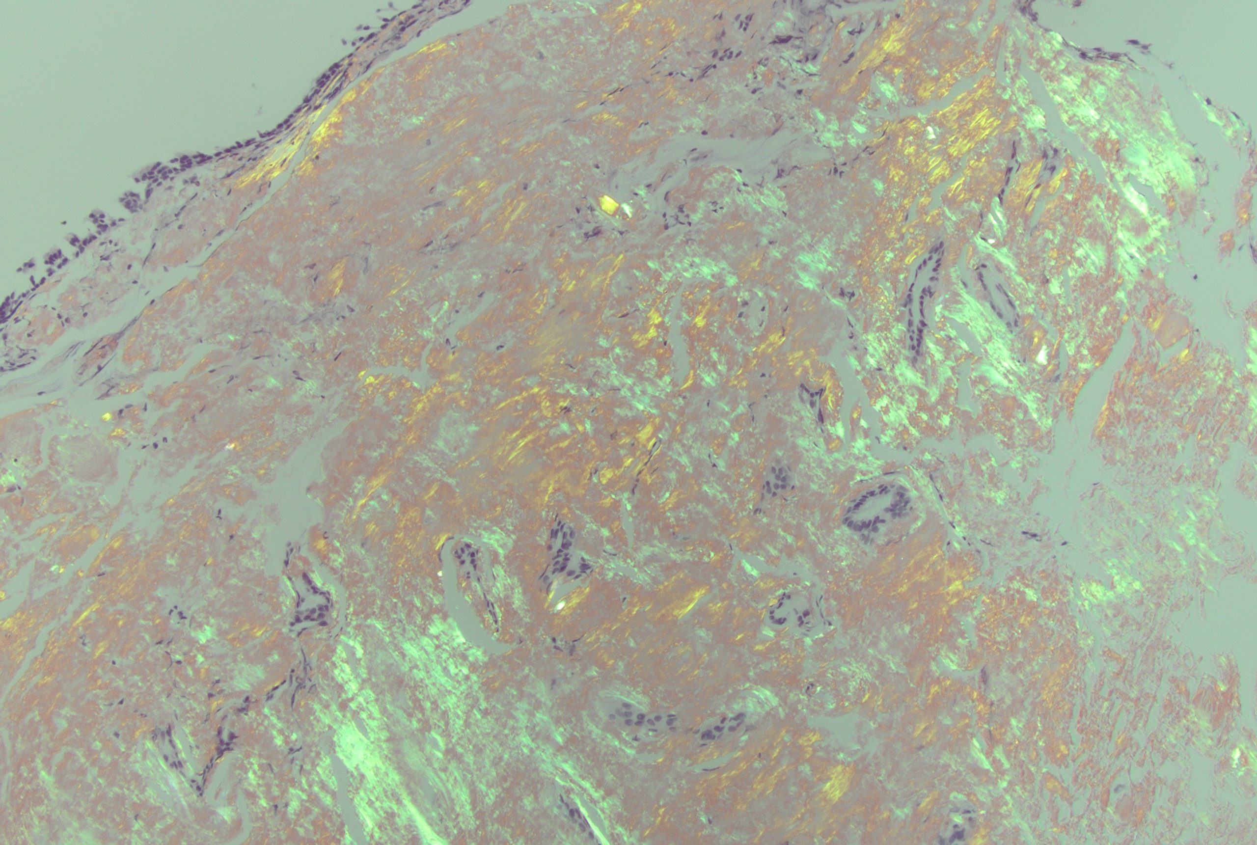 IMAGE 2: Amyloid in bronchial mucosa Congo red stain showing apple green birefringence under polarized light