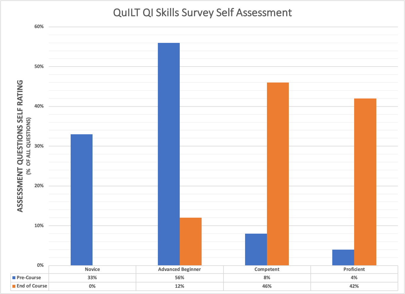 Description: A 9-month longitudinal Quality Improvement and Leadership Training (QuILT) program was developed for physicians within a regional network of community hospitals affiliated with a university-based center. The program consisted of monthly educational sessions by local and national speakers in both QI and Leadership topics, as well as required reading in QI and Leadership, a personal leadership skills assessment survey, and individual coaching for participants. Metrics used to evaluate the impact of the program included a Leadership Skills Assessment Survey and an original survey assessing an individual’s comfort with QI skills and leadership skills administered both at the initiation and completion of the program. Four physicians were selected from 7 applicants to participate in QuILT. All participants were from affiliated community hospital site programs; two of which were from the same community hospital site, while the others were from two separate community hospitals. Of the 4 participants, 3 were 0-3 years out of residency, while 1 was 8-11 years beyond residency training. Only one of the 4 cohort members had previous formal training in QI. Prior to the program, 33% of participants perceived themselves as having “Novice” and 56% having “Advanced Beginner” understanding and comfort in most QI skills. Similarly, 25% of participants rated themselves as having “Weak-Neutral”, 44% having “Neutral”, and 23% having “Neutral-Strong” understanding and comfort in most Leadership skills at the initiation of the program. At the end of the program, 46% stated as having “Competent” and 42% stated as having “Proficient” understanding and comfort in most QI skills. Leadership skills assessment at the end of the program demonstrated 36% having “Neutral” and 47% having “Neutral-Strong” understanding and comfort in most skills. All participants also reported feeling “satisfied” or “very satisfied” with their overall educational experience in the program.
