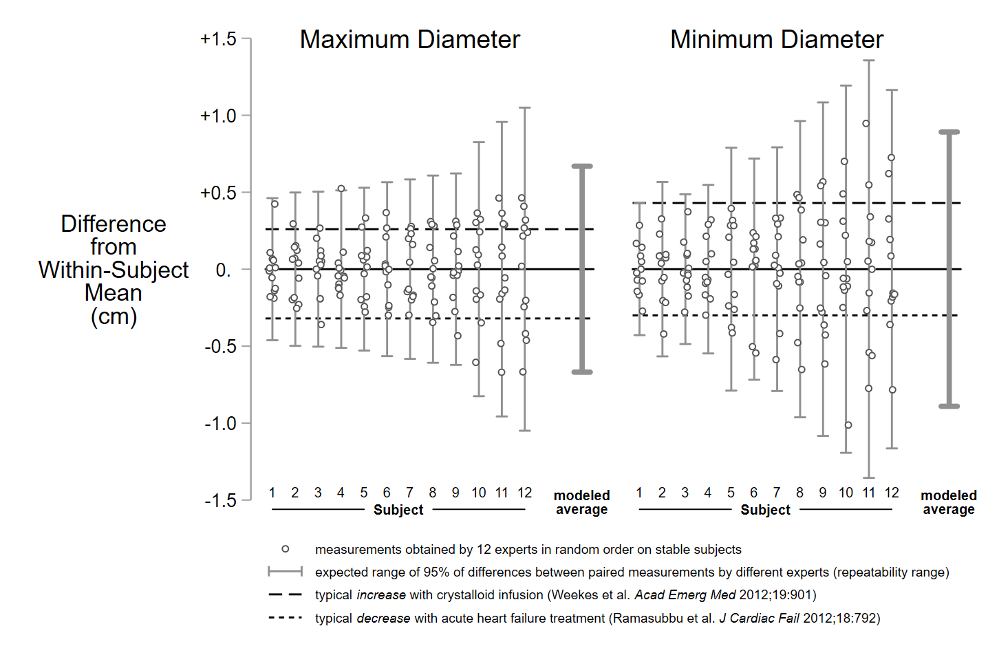 Methods: Our study occurred during the “POCUS for the Hospitalist” pre-course at the 2018 Society of Hospital Medicine national meeting. We enlisted 12 national POCUS experts to obtain measurements from 12 healthy subjects. Each subject remained supine on a gurney next to a POCUS machine equipped with a phased-array transducer. Blinded to others’ measurements, experts rotated in random order and were given 5 minutes to obtain and record measurements of the maximum and minimum IVC diameters from a long axis view while subjects breathed normally. We calculated within-subject standard deviations (Sws) for the 12 experts’ measurements of each diameter type and used multilevel modeling to pool these within-subject standard deviations across subjects. We then calculated ranges of repeatability as our measures of interobserver reliability. These ranges (calculated as 2 × √2 × 1.96 × Sws) are expected to contain 95% of the differences between two measurements on the same subject. Such ranges are clinically useful because only differences that lie outside of them can be confidently distinguished from measurement error. We used published estimates (Figure) to determine the average changes in IVC diameters with diuresis for acute heart failure (average weight loss of 3.6 kg over 8.5 days) and fluid resuscitation (0.9% normal saline bolus of 10 mL/kg over 30 minutes).