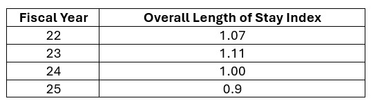 Results: On November 14th, 2023, the 7 services co-managed by the Divisions of Medical Oncology and Hospital Medicine were dissolved. While maintaining the same patient capacity, a new, cohesive solid tumor hospitalist program was launched, ‘Cancer Medicine’ (CM). Standardized triage and bed placement rules were adopted. Geographic patient localization was achieved across 7 inpatient units and maintained over time with >95% unit placement accuracy (December 2023-October 2024). The majority of a service’s patients continue to be isolated to a single unit and floor. Significant improvements in efficiency and patient throughput have been achieved. Since the project’s go live, the length of stay index (LOSi) for oncology hospitalist patients (all dispositions and length of stay groups) is at its lowest of the past several fiscal years (Table 1); the observed LOS has also declined since the intervention start (Figure 1). Time from ED admission request to bed assignment significantly (p=0.0008) improved, as did time from ED admission request to James inpatient bed arrival (p=0.0003), a surrogate for ED boarding hours.