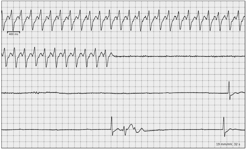 The ECG patch analysis later showed several prolonged episodes of VT, including one that corresponded with his third episode of syncope. It also showed several apparently asymptomatic pauses of 5 seconds or longer (the longest being 12 seconds), usually during the recovery period from VT.