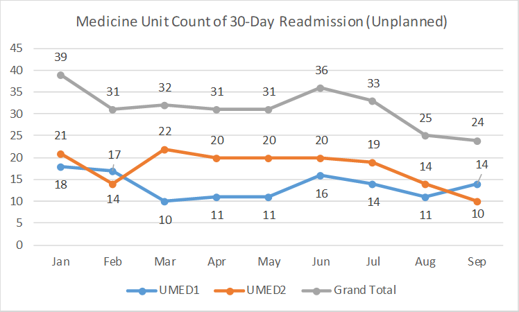 • 30-day re-admission rate was better in PA TEAM UNIT 2 (11.02%) as compared to IM RESIDENT UNIT 1 (13.24%)