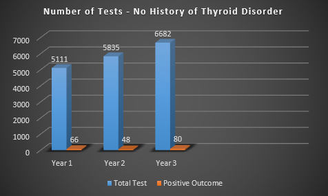 Results: Total of 24,243 TSH tests(t) were sent on 22,123 visits(n) to selected services, irrespective of history of thyroid disorder. Of these 17,628 (72.7%) tests were ordered in visits with no history of thyroid disorder (n = 16,129). 13,093 and 3,036 visits were flagged normal and abnormal, respectively (81.17% vs 18.83%). Total 136 (0.84%) visits resulted in a positive outcome (t=194; 1.1%). In regards to fT4, 4995 (96.63%) of 5169 tests resulted in no outcome. Over the 3-year period of study, of the 136 visits with positive outcome, only 54 had overt hypo/hyperthyroidism. Total 4,103 bTFTs (23.27% of total TSH tests) were sent as an initial screening test for thyroid disorder over the same period. Based on the 2016 National Limitation Amount, $153,467/year worth of thyroid-function tests (TFTs) were ordered at a single center resulting in no positive outcome.