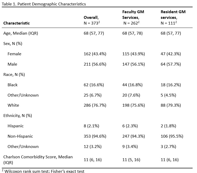 Methods: Patients > 18 years old admitted to GM at an academic medical center with subsequent rapid response team (RRT) activation and transfer to the ICU from 7/2022 – 6/2024 were identified. Patients were excluded if admitted directly to an ICU or if RRT < 24 hours after admission. Variables collected included demographic features, Charlson comorbidity index (CCI) score, team structure (faculty vs resident), length of stay (LOS) prior to ICU transfer, code status order, and palliative care consultation. Quality of GOC documentation was assessed based on presence of five key components previously described in the literature: mention of prognosis or patient understanding of illness, patient values and/or goals, identification of durable power of attorney (DPOA) or personal representative, use of and/or limitations of specific life sustaining interventions, and participants in discussion. Documentation of >= 2 components – excluding mention of participants – was considered high quality GOC documentation. Data was analyzed using bivariate analysis and logistic regression models.