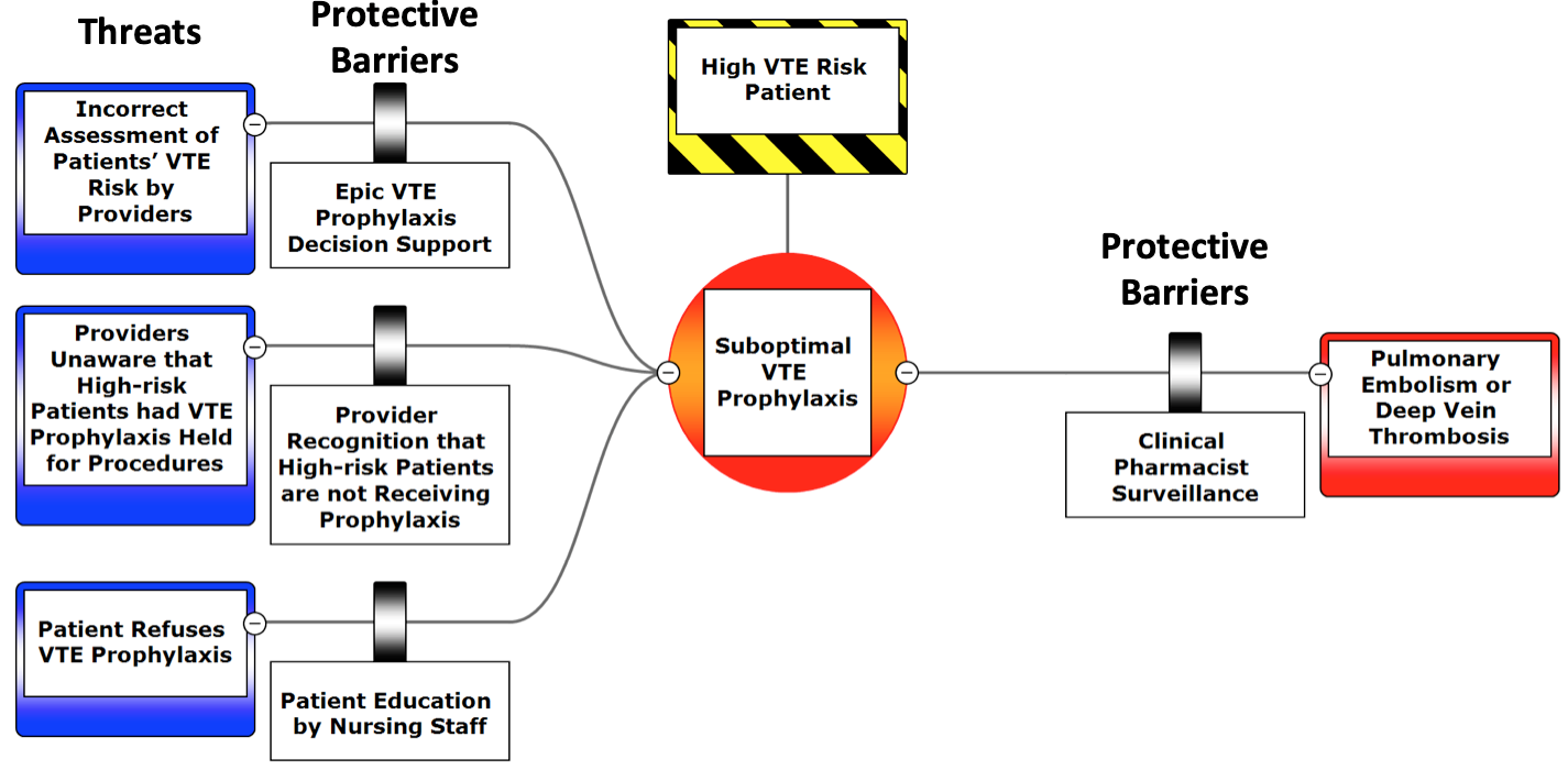 Conclusions: Based on the analysis, our institution is implementing the following interventions: 1) upgrading Epic VTE decision support to reflect evidence-based guidelines, 2) standardizing clinical pharmacy workflow to improve surveillance of VTE prophylaxis, and 3) standardizing scripts for nurses to educate patients refusing VTE prophylaxis. In conclusion, we were able to combine QI methodologies used by other industries, specifically Bow-Tie analysis, with lean six-sigma to develop interventions to reduce HA-VTEs. Bow-Tie analysis potentially offers a formalized method to assess process failures and design interventions to improve the quality of patient care.