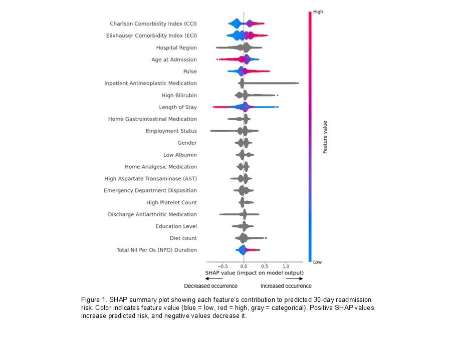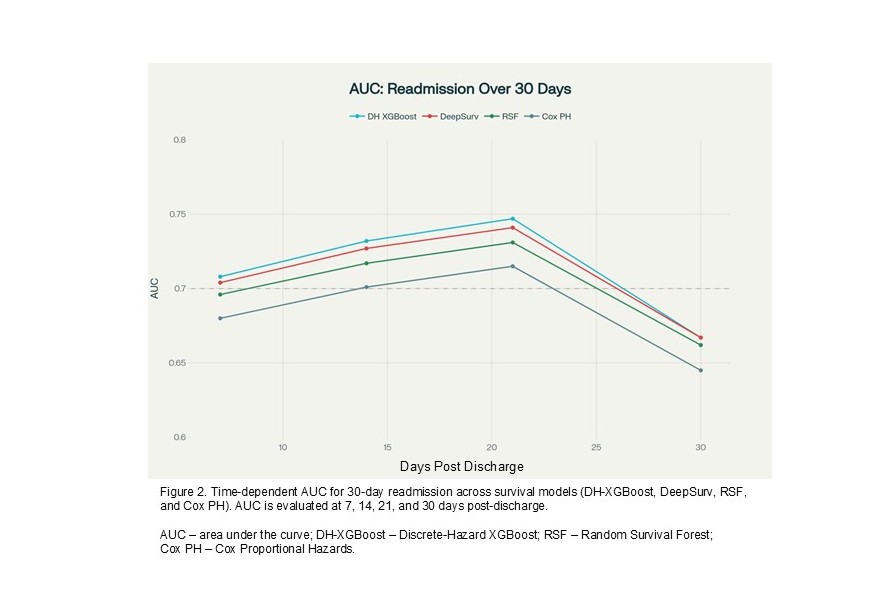 Results: The cohort had mean (±SD) age of 59.2 (±18.4) years with 50.9% female, and 30-day readmission rate of 12.7%. Predictors common to both binary classification and survival analysis included antineoplastic, cardiovascular, anti-viral, anti-fungal, and immunosuppressive medication; elevated bilirubin and aspartate transaminase (AST); low albumin and potassium; and comorbidity burden. The binary XGBoost model had an AUC 0.757 (0.756‒0.759) vs. 0.640 for LACE+, PR-AUC 0.341 (0.333‒0.349) vs. 0.191 for LACE+, Brier score 0.098 (0.097‒0.099), and F1-score 0.377 (0.372‒0.382). Among survival models, the discrete time hazard XGBoost had the highest performance (C-index 0.732 with 95%CI 0.730-0.735) and mean time-dependent AUC (0.714). Time-dependent AUC showed optimal discrimination at 21 days (AUC 0.747) with decline at 30 days (AUC 0.667), revealing temporal patterns in prediction accuracy. DeepSurv (C-index 0.731 with 95%CI 0.727-0.734), Random Survival Forest (C-index 0.723 with 95%CI 0.717-0.729), and Cox PH (C-index 0.70 with 95%CI 0.702-0.713) showed lower but acceptable discrimination. DeepSurv model demonstrated excellent risk stratification, with an 8.93-fold higher readmission in the highest-risk (27.0%) compared to the lowest-risk (3.0%) quartile.