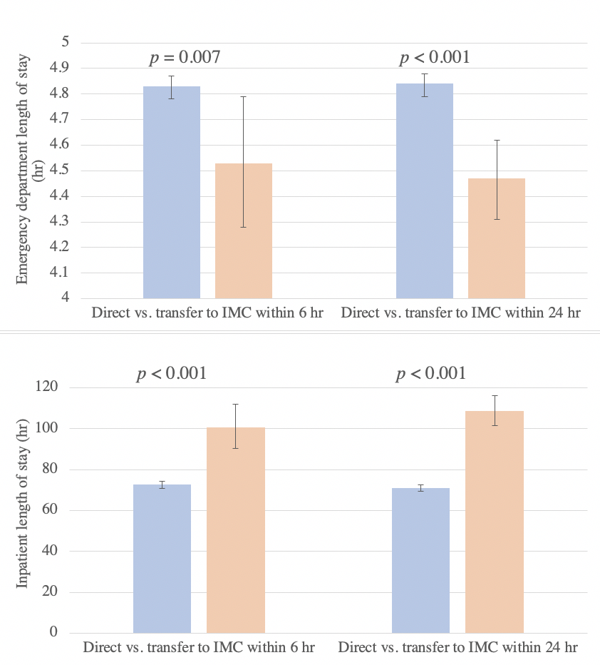 Methods: We investigated the demographics, clinical features, and hospital length of stay of 10,316 patients transferred within 6 or 24 hours vs. directly admitted to the IMC.