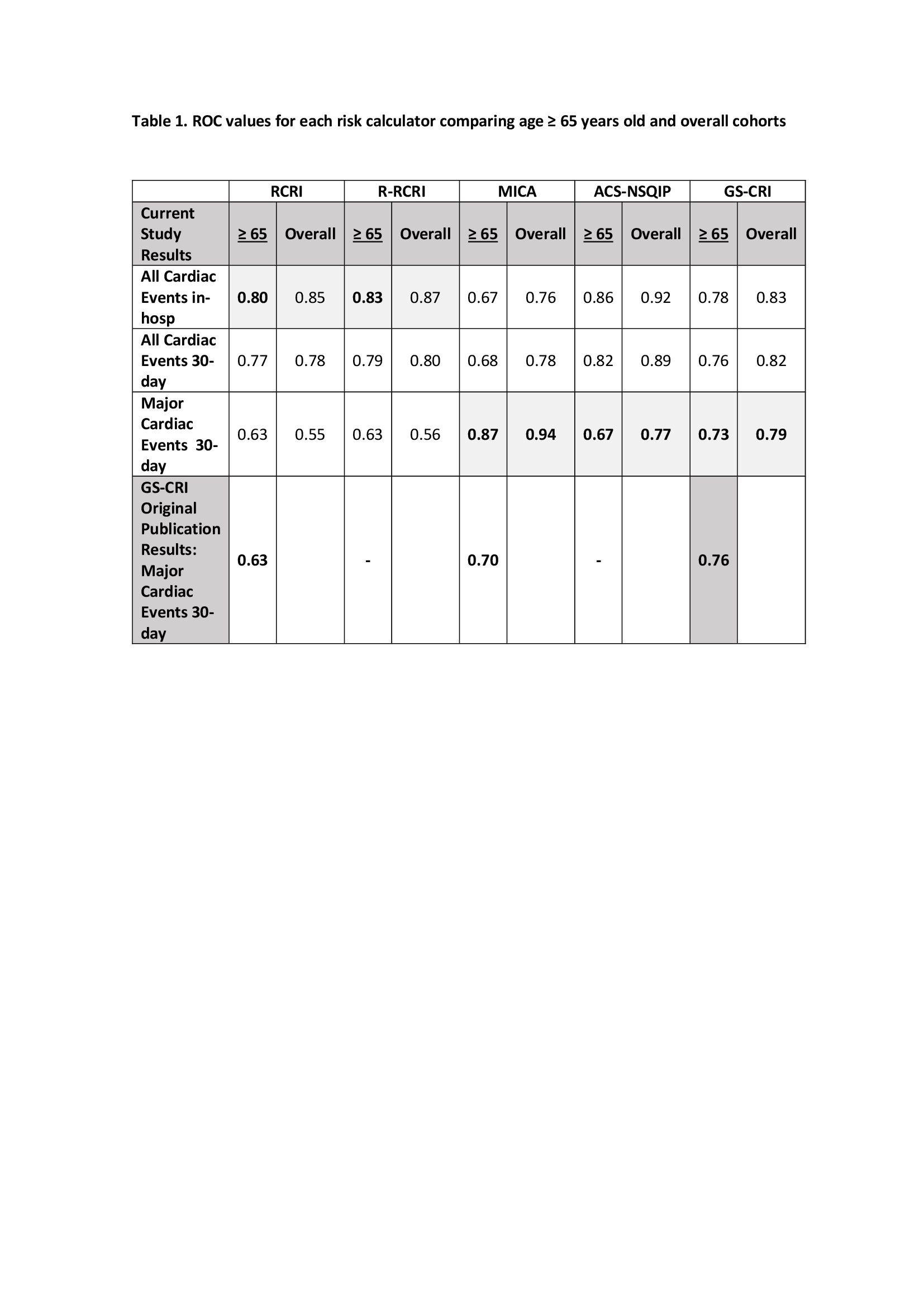 Conclusions: All four risk calculators performed well in the geriatric population (≥ 65 years old) especially when used to predict what they were designed to do (predict in-hospital MI, VF/CA, pulmonary edema and CHB in patients undergoing major noncardiac surgery in the case of RCRI and R-RCRI and predict MI and cardiac arrest 30-day after surgery in the case of MICA, ACS-NSQIP and GS-CRI).
