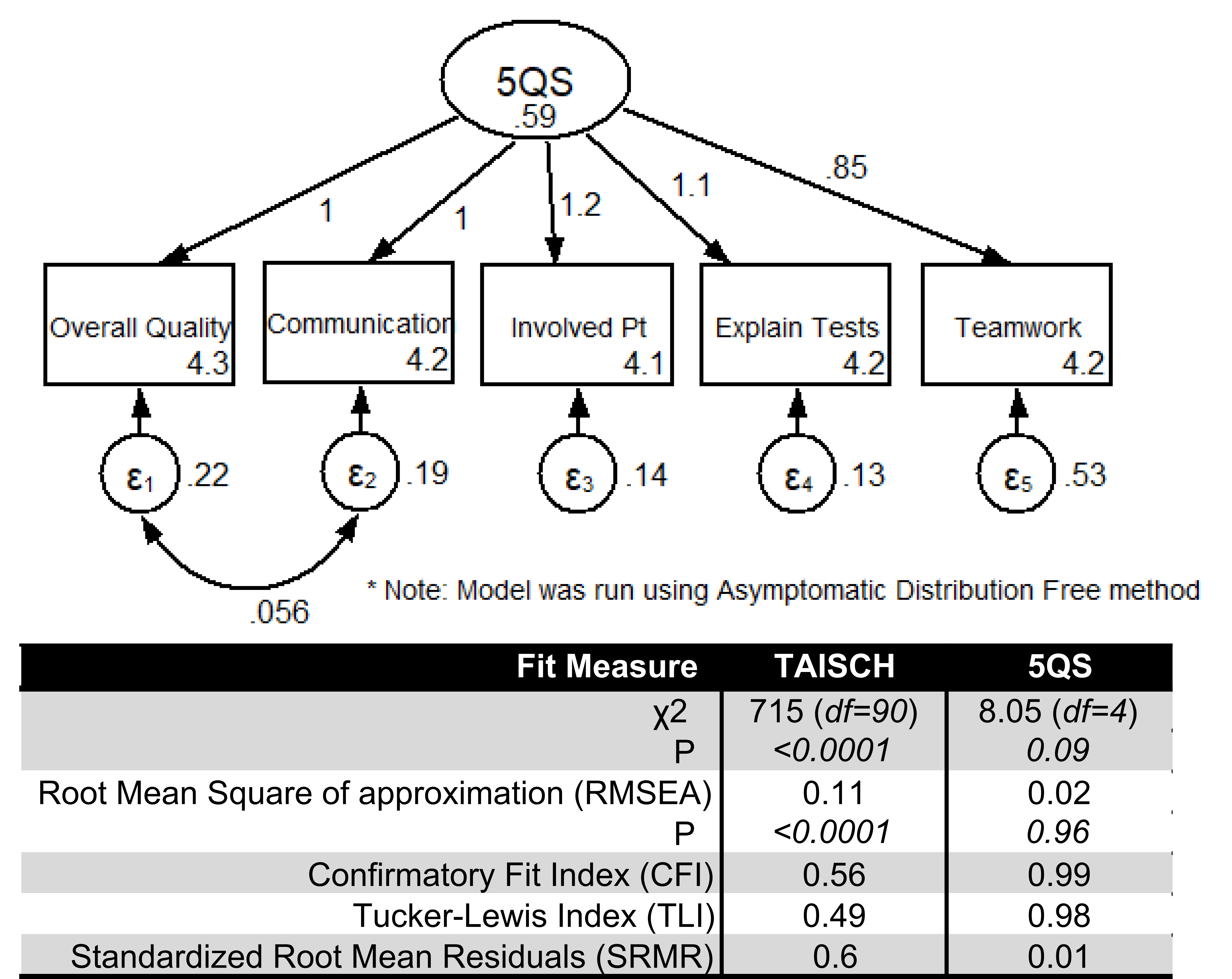 Results: Of the 1723 patients who completed 5QS, 612 also completed the TAISCH. The study population consisted of 54% females, 84% Caucasians and had a mean age of 53.6 (17.3) years, mean 5QS score of 4.2(0.8), and mean TAISCH score of 3.8(0.7). The Cronbach alpha for the 5QS was 0.93 and for TAISCH was 0.90. In exploratory factor analysis, all questions from the 5QS loaded on a single factor highlighting strong construct and face validity. The CFA found adequate convergent and discriminant validity and showed strong fit of the model to the data using routine diagnostic statistics (Figure). In contrast, CFA found poor fit of the TAISCH to the data (Figure).