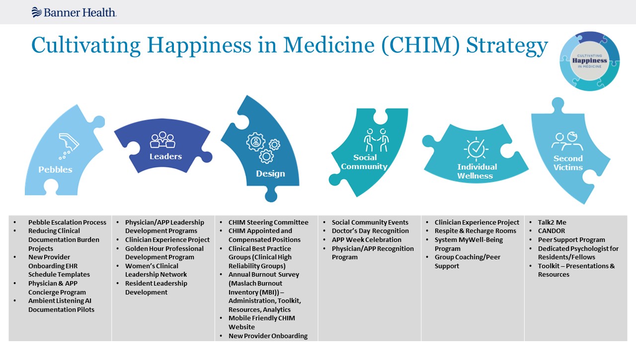 Background: In 2019, Banner Health innovated by launching Cultivating Happiness in Medicine (CHIM), which was Banner’s commitment to supporting physician and APP well-being and reducing burnout. The CHIM strategy is evidence-based, physician and APP driven, and holistic, supporting clinicians from individual wellness and organizational workplace environment perspectives. The six dimensions of the strategy include the following:· Design: Creating organizational systems that address the human needs for meaning, purpose, and autonomy in work.· Leaders: Developing leaders who will collaborate and engage with physicians and APPs as trusted partners and practice participative management by involving them in problem-solving and decision-making.· Social Community: Creating opportunities for physicians and APPs to build relationships with their colleagues and cultivate community and camaraderie.· Individual Wellness/Well-being: Promoting resources and programs that help physicians and APPs develop healthy habits such as mindfulness, resiliency, exercise, sleep, nutrition, mental/emotional health, and more.· Second Victims: Reducing preventable harm and supporting staff members involved with a preventable adverse patient event (second victims) by providing emotional and psychological support, addressing the root cause, and establishing a fair and just culture.· Pebbles: Removing sources of workflow, process, operational frustrations, and inefficiencies that act as the “pebble in your shoe.”
