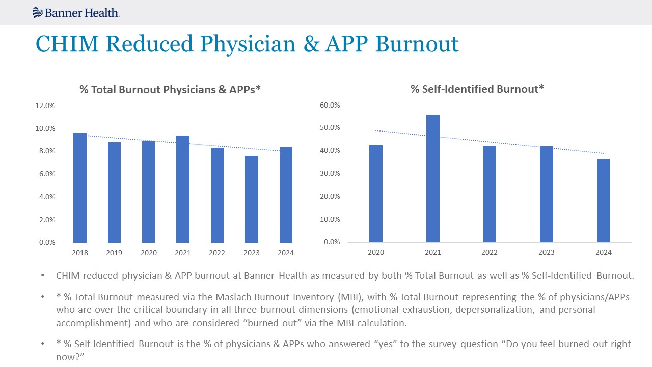 Conclusions: CHIM has reduced physician & APP burnout in Banner Health. Organizations are often quick to focus only on individual wellness (mindfulness, yoga, mental/emotional health resources, healthy living habits, etc.) without also focusing on improving the workplace environment (removing operational pebbles, enhancing leadership, supporting the social community, designing human systems for autonomy/purpose, supporting second victims). By focusing on supporting the individual physician/APP, improving the workplace environment, and ensuring that the efforts are physician/APP-led, CHIM has demonstrated a scalable and sustainable approach to reducing physician/APP burnout and enhancing well-being.