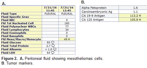 Case Presentation: A 58 year old female with past medical history of microcytic hypochromic anemia and thrombocytosis presented with progressive abdominal distention and pedal edema of 5 months duration. There was no significant history of asbestos exposure.Initial diagnostic paracentesis and peritoneal fluid cytology was negative for malignant cells but showed atypical cells, but tumor markers such as CA 19.9 and CA 125 were elevated. CT scan showed peritoneal nodularity suggestive of peritoneal carcinomatosis and peritoneal biopsy confirmed the diagnosis of peritoneal mesothelioma.