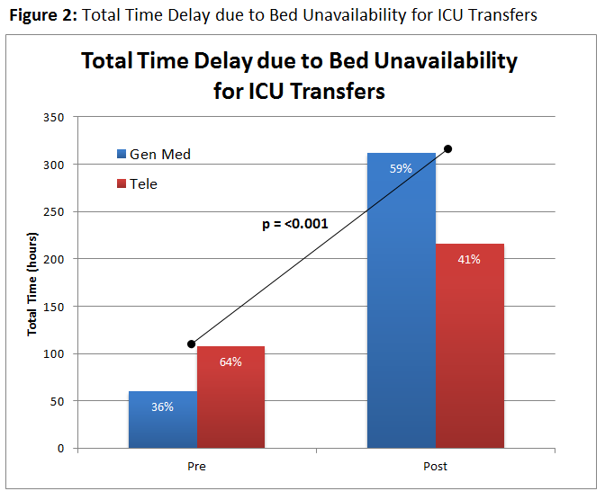 Conclusions: Telemetry bed unavailability was a major institutional factor associated with longer ICU LOS. Dedicated provider education on updated telemetry recommendation appeared to reduce total time delay due to lack of telemetry for ICU step-down transfers. However, lack of change in overall ICU transfer delays may relate to other institutional restraints, requiring further evaluation and intervention.