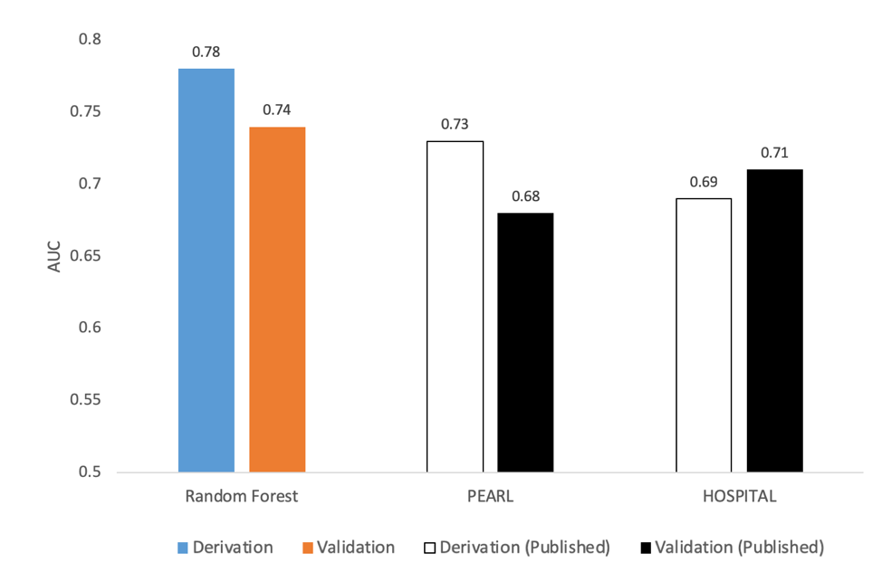 Results: Of the 182,940 admissions during the study period, 1,328 met our inclusion criteria, of which 306 had a 90-day readmission. The most important predictors for 90-day readmission included maximum creatinine value during the encounter, minimum red blood cell count, and minimum body temperature (Figure 1). Other predictors included the results of respiratory cultures and whether the patient was admitted during the winter months. At the 90-day prediction horizon, RFML had an AUC of 0.78 in the derivation set and an AUC of 0.74 in the validation set. This compares favorably to the HOSPITAL and PEARL scores, which have published validation AUCs of 0.71 and 0.68, respectively (Figure 2).