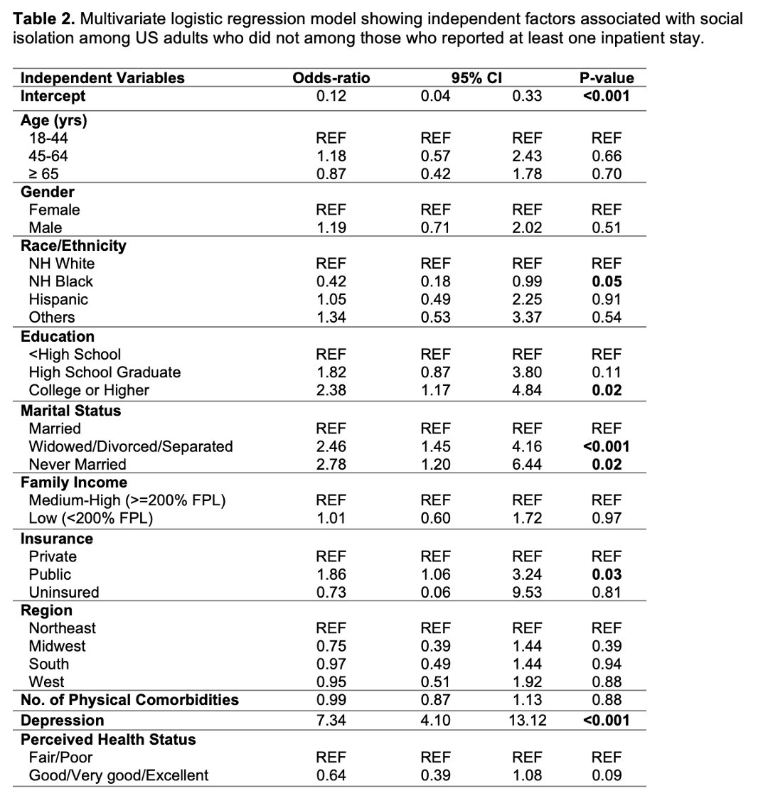 Results: Of the total weighted study sample of 16,520,260 US adults, about 33% reported social isolation. On the univariate analysis, social isolation was significantly present in those who were widowed, divorced, separated, or unmarried; low-income; had public health insurance like Medicare or Medicaid; had depression and reported fair to poor perceived health status (Table 1). On adjusted models, factors independently associated with social isolation were college graduates or higher (OR 2.38, 95% CI 1.17-4.84); widowed, divorced, or separated (OR 2.46, 95% CI 1.45-4.16), or unmarried (OR 2.78, 95% CI 1.20-6.44); those with public health insurance (OR 1.86, 95% CI 1.06-3.24), and depression (OR 7.34, 95% CI 4.10-13.12) (Table 2).