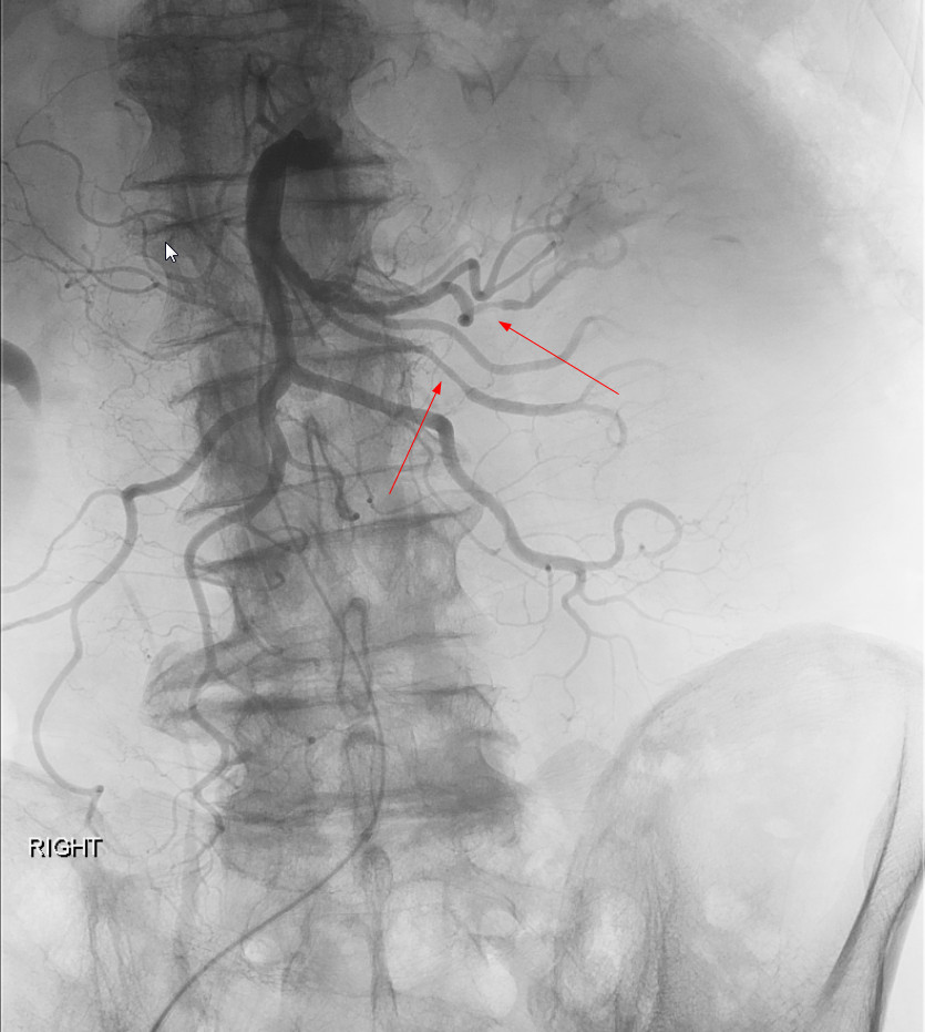 Case Presentation: 76-year-old male with a recent diagnosis of low-grade MDS presented to the hospital with complaints of severe fatigue, anorexia, abdominal pain and a 60 pound weight loss over six months. He also had a history of right foot drop 2 months prior with unclear etiology. He was subsequently hospitalized 1 month before presenting to our hospital with increasing abdominal pain, CT abdomen showed ileitis and mesenteric lymphadenopathy. He was treated with broad spectrum antibiotics with minimal improvement. Initial studies at our hospital showed pancytopenia with values near baseline, an elevated sedimentation rate of 82 mm/hr and C-reactive protein of 72.5. He had normal electrolytes, creatinine, copper, vitamin B 12 and vitamin-D levels. Urinalysis was within normal limits and serum protein electrophoresis did not show any monoclonal proteins. Complement and cryoglobulin levels were within normal limits. His serologies including ANA, ANCA, antiphospholipid antibody levels, hepatitis B and C were within normal limits. EMG of the lower extremities showed involvement of right distal sciatic nerve or both tibial and peroneal nerves. Colonoscopy revealed nonspecific inflammation of the colon. CT angiography revealed aortoiliac atherosclerosis but no evidence of vasculitis. Mesenteric angiogram was ordered due to high suspicion for vasculitis which revealed areas of narrowing along the superior & inferior mesenteric artery. This confirmed a diagnosis of polyarteritis nodosa (PAN). Following this the patient was given pulse dose steroids for 2 days followed by a slow taper. Further evaluation of MDS with T-cell receptor analysis was recommended.