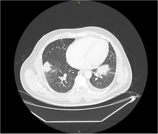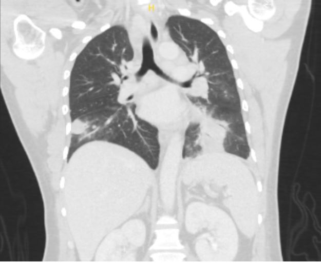 Case Presentation: A 36-year-old male with no significant medical history presented with one week of nocturnal fevers, rigors, cough associated with night sweats and 5 kg weight loss over one month. He immigrated from Guatemala 18 months ago, briefly lived in Arizona and Texas, and has worked as a landscaper locally for the past year. Review of system was negative for chest pain, shortness of breath, rashes, recent illness, or sick contacts. On admission, he had a fever of 39.4°C and was saturating 97% on room air. Physical exam was pertinent for course lung-sounds bilaterally and no skin rashes or ulcerations. Blood work was significant for leukocytosis (13.24 K/uL with neutrophilic predominance). CT Chest showed mass-like opacities in the bilateral lower lobes and left upper lobe, mediastinal and hilar lymphadenopathy, bilateral pleural effusions, and a 6mm right lung nodule (figure 1 and 2), raising concerns for neoplastic, rheumatologic, and/or infectious etiology. Our initial infectious workup, including blood and sputum cultures, HIV testing, tick-borne panel, and endemic mycoses was negative and the patient showed no improvement of symptoms or leukocytosis despite treatment with cefepime and azithromycin. On hospital day 7, bronchoscopy with lymph node biopsy was performed. Fevers persisted despite treatment with cefepime, azithromycin, and minocycline. Further infectious workup for fungal pathogens, Tuberculosis, and Coxiella was negative. Rheumatologic and oncologic workup with ANA, RF, vasculitis panel, and peripheral flow were also negative. On hospital day 14, send out testing for Tularemia IgG and IgM was positive, alongside pathology showing necrotizing granulomas positive for Francisella tularensis DNA. His antibiotic regimen was switched to IV gentamicin and PO doxycycline, leading to immediate symptom improvement on day 2 of treatment. The patient completed 10 days of targeted antibiotic therapy in-patient due to lack of insurance, with rapid resolution of fever, leukocytosis, and symptoms.
