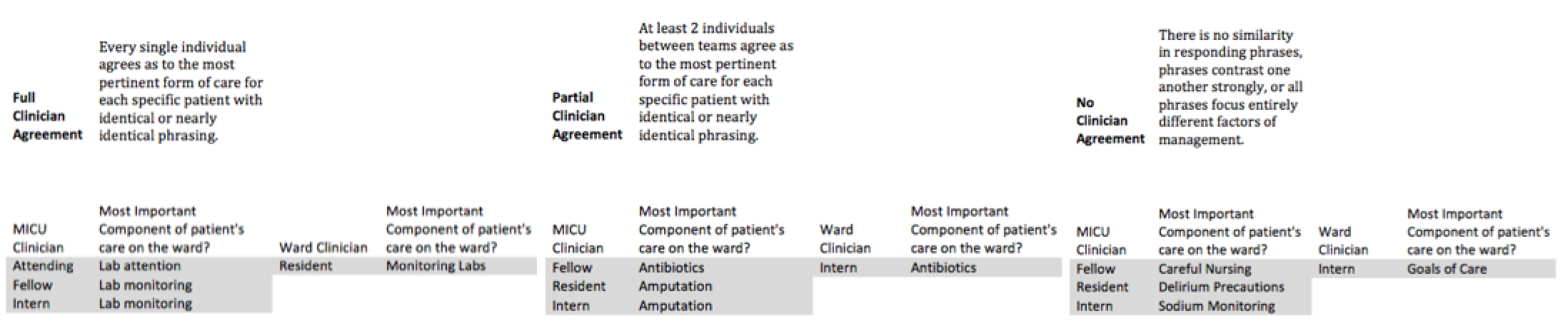 Results: For 199 unique patients transferred from ICU to ward, a total of 464 ICU and 212 ward clinicians responded, with at least one ward provider and one ICU provider represented. Complete data was available for 115 unique patient cases where both intra-team and inter-team agreements were determined. For 46.9% of patients, there was no inter-team agreement on the most important component of patient care (9.6% full, 43.5% partial). Intra-team agreement among ICU clinicians at time of transfer was better: 20.9% complete, 22.6% strong, 18.3% weak, and 38.3% no intra-team MICU agreement. There was a significant positive correlation between inter-team and intra-team agreement (⍴=0.3082, p=0.008). There was a positive association between the level of inter-team agreement measured qualitatively and the numeric difference of rated likelihood of readmission between ICU and ward clinicians (F=3.12, p=0.0470).