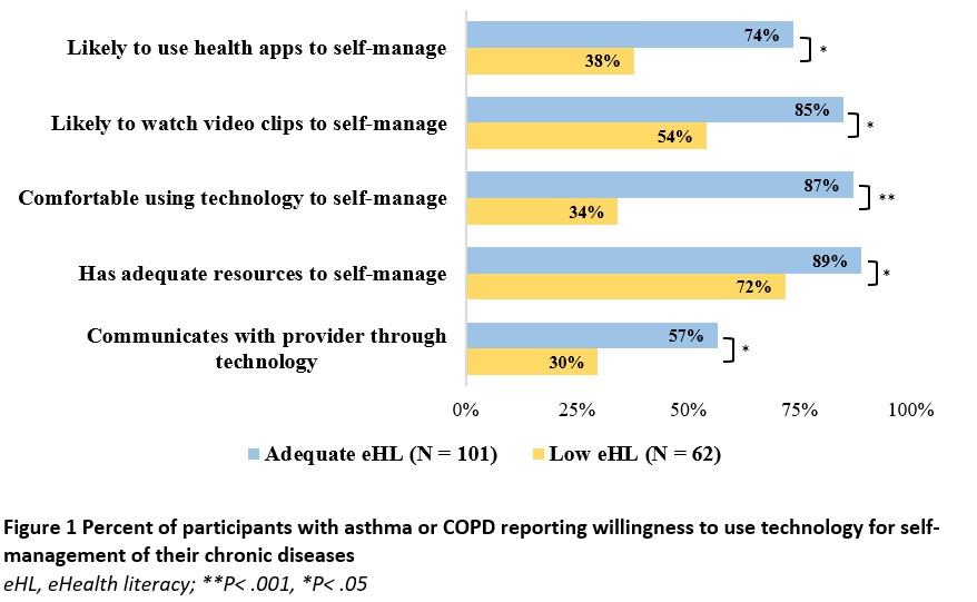 Conclusions: Most hospitalized patients with asthma or COPD in our study access eHealth information and demonstrate willingness to use technology to manage their chronic diseases. Willingness to use health applications and reported self-efficacy in asthma or COPD management were significantly associated with higher eHL. Results of this study highlight the importance of evaluating eHL in considering equitable access to digital self-management resources and ensuring safe transitions of care.