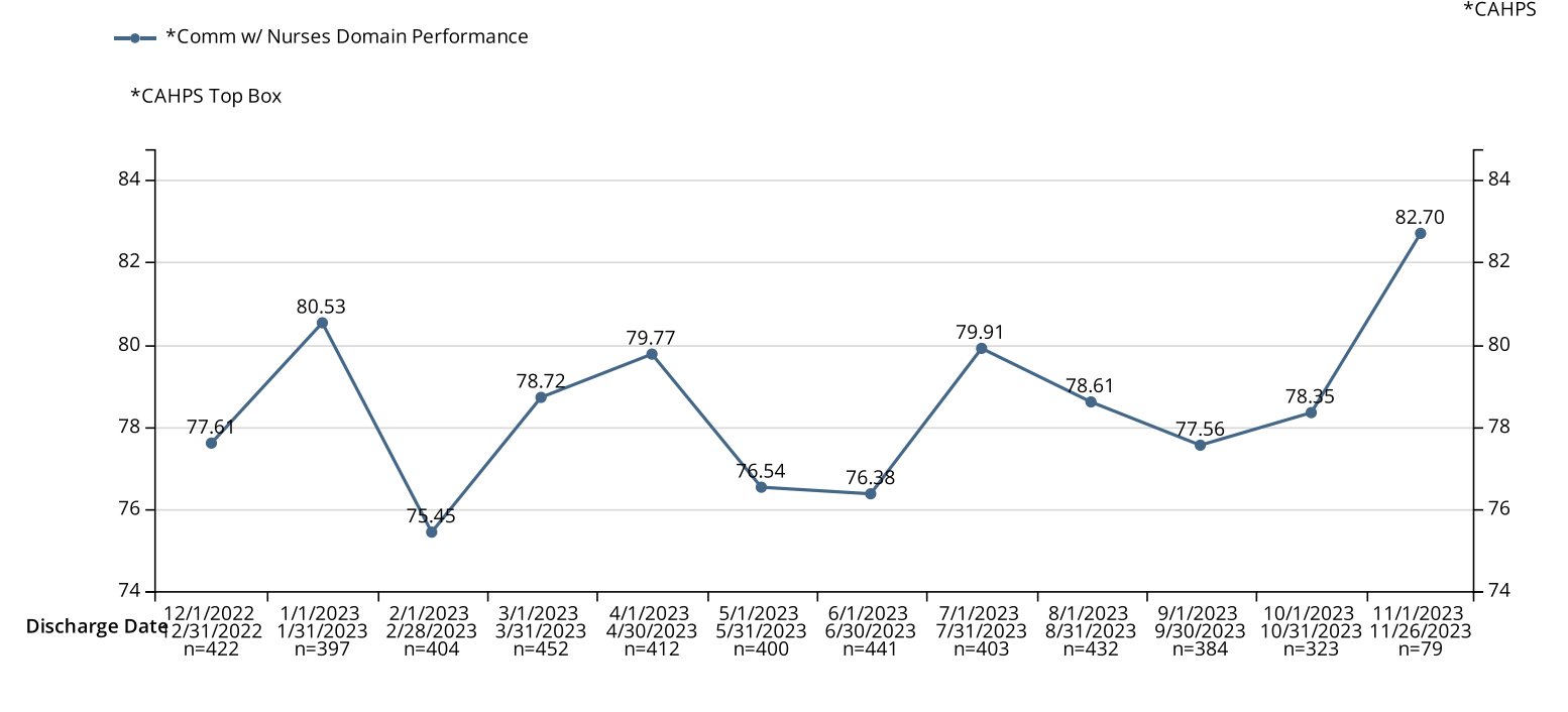 Description: Empathy Connections include implementation of empathy statements with every patient, every day. Empathy statements include “What concerns do you have today that I can help you with?”, used daily by all staff members and “What concerns do you have about going home ?”, used on a day of discharge . Team members are coached to use empathy statements by PEX team and department leaders during empathy sessions. We also shared print-outs, included Empathy Connections discussions and reminders during the regular staff meetings and introduced leader rounds to reinforce the intervention. To assess the effectiveness of the initiative, we have been monitoring the Press Ganey (PG) scores by the discharge date. We are aiming to achieve our corporate targets for physician communication (78.9%, 44th percentile rank) . Nursing communication has been monitored to compare the potential impact of empathy statements use on physician communication. Our physician and nursing communication trends , since implementation of Empathy Connections in July 2023 are shown in fig 1. and fig 2. As shown in fig.1 , before implementing Empathy Connections, our physician communication reached our hospital system’s target only once- in December 2022. Since Empathy Connection implementation beginning in July 2023, we have reached the target three times. Fig. 2 represents nursing communication, with no significant trend change noted since our intervention.