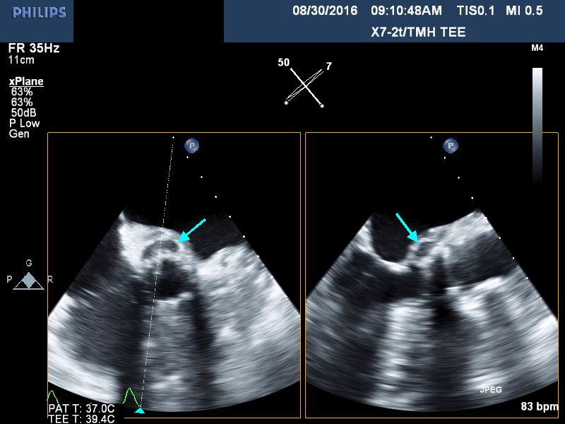 Case Presentation: 85 year old female was admitted on account of lethargy and decreased oral intake for the previous week, and evidence of anemia. She had undergone a transcatheter aortic valve replacement(TAVR) 5 months prior for her management of her severe aortic valve stenosis. Additionally, she suffered from recurrent gastrointestinal bleeding due to arteriovenous malformations, thought to be related to her valvular disease.(Heyde syndrome).Upon presentation she was febrile; temperature of 100.6 F, Heart rate was 87/min, Blood pressure: 121/56mmHg. She was not hypoxic. She was ill-appearing with a mild degree of pallor but anicteric. She had normal heart sounds with a 2/6 systolic murmur at her right upper sternal border. Chest: No wheezes or crackles. Abdomen: Soft and non-tender. Stools: heme-negative. CNS: Awake and alert. No motor deficits. EXT: no edema, clubbing, nodes or hemorrhages noted. Lab. data: WBC :18.1, Hb: 8 g/dL, AST 133 iu/L, ALT 80 iu/L, direct bilirubin 0.6 mg/dL, lactate 1.3 meq/L .Blood cultures were obtained and she was started on broad spectrum antibiotics. Her initial set of blood cultures returned positive for Enterococcus faecalis and she was placed on IV Vancomycin. Transthoracic echocardiogram revealed a well seated bioprosthetic aortic valve with a gradient of 31 mmHg but without any evidence of vegetations. Subsequent transesophageal echocardiogram demonstrated a 5 mm by 8 mm mobile density attached to the ventricular surface of the bioprosthetic aortic valve leaflet (Fig. 1) as well as a 6 mm by 16 mm echolucent space in the aortic root (Fig. 2), consistent with aortic root abscess.